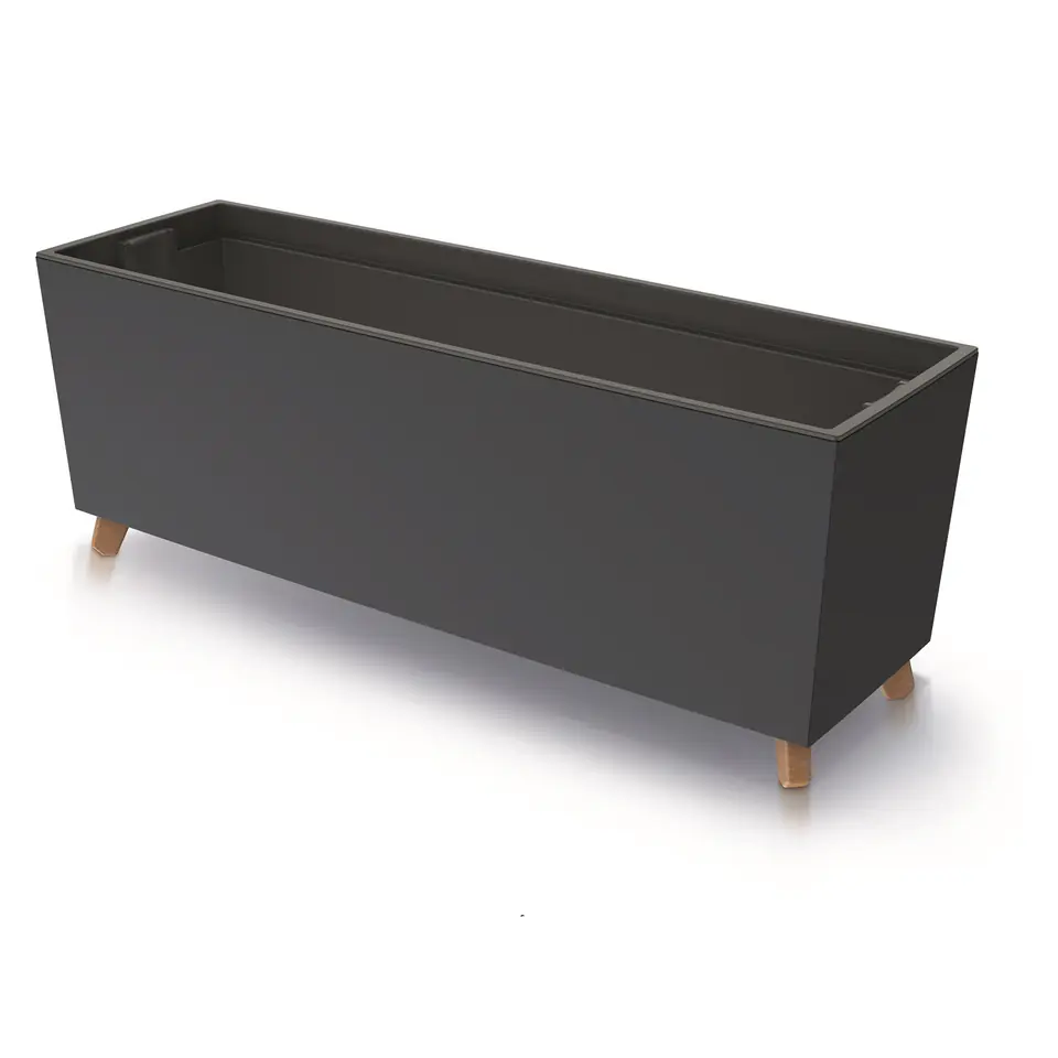 Cechy- Funkcjonalna i estetyczna skrzynka wykonana z tworzywa sztucznego- Przykuwa uwagę elegancką matową powierzchnią- Skrzynka będzie mocnym akcentem przy tworzeniu klimatycznego wnętrza i aranżacji przestrzeni wokół domu- Podwyższona na odzwierciedlających drewno nogach- Wyposażona w wyjmowany wkład- Wysoka jakość wykonania- Produkt renomowanej polskiej firmy Prosperplast- Długość: 770 mm- Szerokość: 235 mm- Wysokość: 300 mm- Kolor: antracytowy