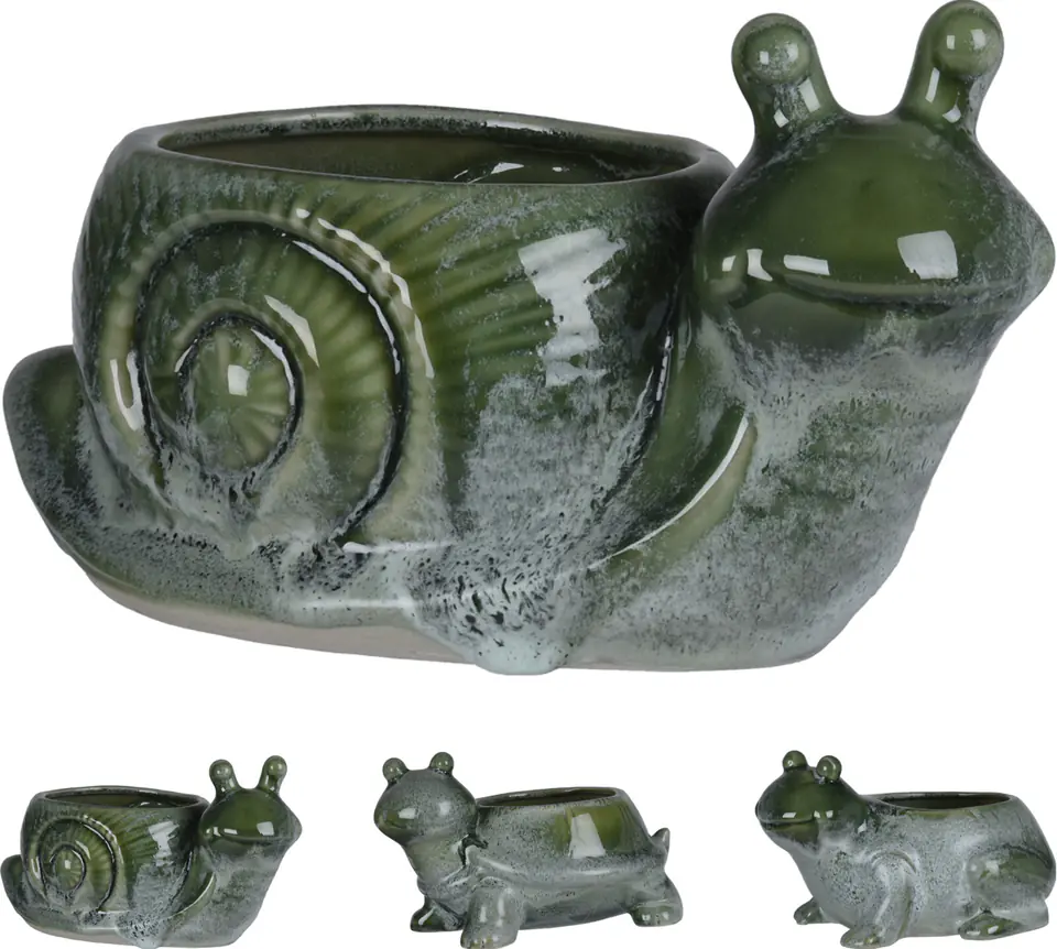 ZWIERZĘTA DONICZE, PORCELANA, ROZMIARY ŻÓŁW: 16,5X23,5X14CM, ŻABA: 17,5X23X14CM, ŚLIMAK: 14X24X14CM, WAGA: 860 G, W REAKTYWNYM WYKOŃCZENIU, GŁĘBOKO ZIELONY KOLOR, KAŻDA SZTUKA Z NAKLEJKĄ Z KODEM KRESKOWYM / CFT 235X165 ,83, (9.500/40 stóp kwatery głównej)