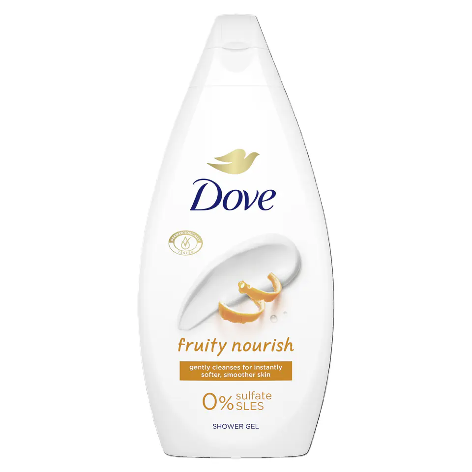 Delikatny żel pod prysznic Dove Fruity Nourish, orzeźwiającym owocowym zapachu, łagodnie oczyszcza zapewniając bardziej miękką i gładszą skórę już po jednym prysznicu.
