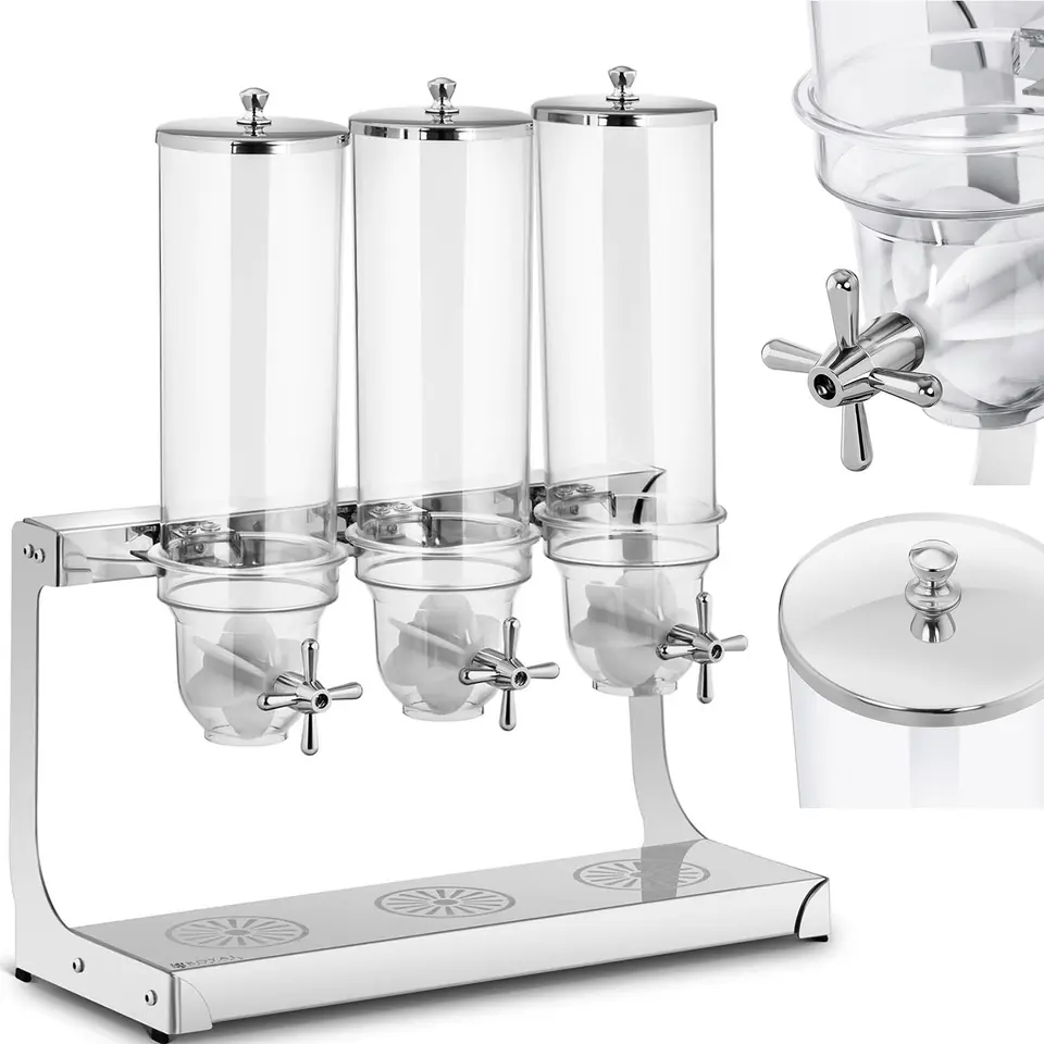 Kod producenta: 10011387Praktyczny dozownik do płatków Royal Catering umożliwia przechowywanie i wygodne dozowanie sypkich produktów: płatków śniadaniowych, niewielkich herbatników i ciastek, cukierków, orzechów, suszonych owoców, kawy. Znajdzie zastosowanie wszędzie tam, gdzie podawane są śniadania w formie bufetu - w hotelach, restauracjach czy bistrach.Przezroczysty cylinder wykonany z plastiku ma 10,5 litra, doskonale izoluje produkty przed działaniem czynników zewnętrznych.Cechy produktu:
