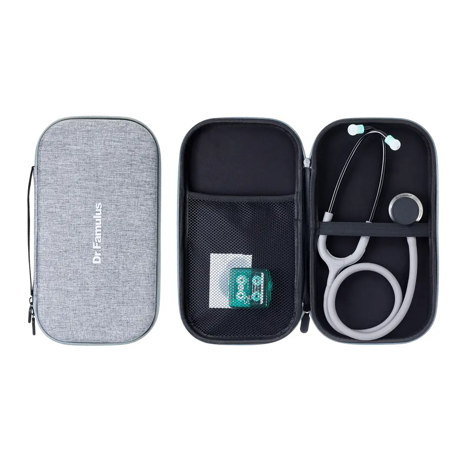 Sztywne etui do stetoskopów ; Wygodne i eleganckie etui do stetoskopów od marki Dr.Famulus to uniwersalny pokrowiec, który będzie pasował do różnego rodzaju stetoskopów niezależnie od ich przeznaczenia i marki (m.in. Littmann, MDF Instruments, RIESTER, Kamed i inne). Etui zostało zaprojektowane z myślą o zapewnieniu najwyższej ochrony dla delikatnego urządzenia, jakim jest stetoskop. Etui do stetoskopów to minimalistyczny design i przemyślana konstrukcja dla zapewnienia maksimum bezpieczeństwa. Bezpieczna i wytrzymała konstrukcja. Zewnętrza obudowa etui jest usztywniania, zapewnia bezpieczeństwo przechowywanego w nim stetoskopu, chroni przed uszkodzeniami mechanicznymi i zabrudzeniem. Kieszonka na akcesoria. Etui na stetoskop zawiera specjalną kieszonkę, która służy do przechowania akcesoriów do stetoskopu takich jak: wymienne oliwki, czy zestaw naprawczy. Gumka podtrzymująca stetoskop. Etui zostało wyposażone w specjalną miękką gumkę, która zapewnia sztywne przyleganie stetoskopu do ściany etui tak, by pozostawał on w jednym miejscu podczas transportu. Gumka umożliwia wygodne zaczepienie najbardziej delikatnej części stetoskopu, jaką jest głowica z membraną. Miękka wyściółka. Wnętrze etui wyścielone jest delikatną wyściółką, która nie tylko stanowi element amortyzujący, ale także nadaje elegancki wygląd. Miękki materiał w środku etui to gwarancja, ze stetoskop nie ulegnie zarysowaniu lub uszkodzeniu podczas transportu. Ekspres z podwójnym zamkiem. Etui jest wyposażone w wytrzymały ekspres błyskawiczny, który umożliwia łatwe otwieranie i zamykanie etui z jednej i drugiej strony. Etui z rączką do przenoszenia. W trosce o maksimum ergonomii i wygodny użytkowania etui do stetoskopu zostało wyposażone również w praktyczny uchwyt, który ułatwia wygodne przenoszenie. Wysokiej jakości materiały. Etui zostało wykonane z materiałów odpornych na zabrudzenia i łatwych do szybkiego zmycia ewentualnych zabrudzeń.