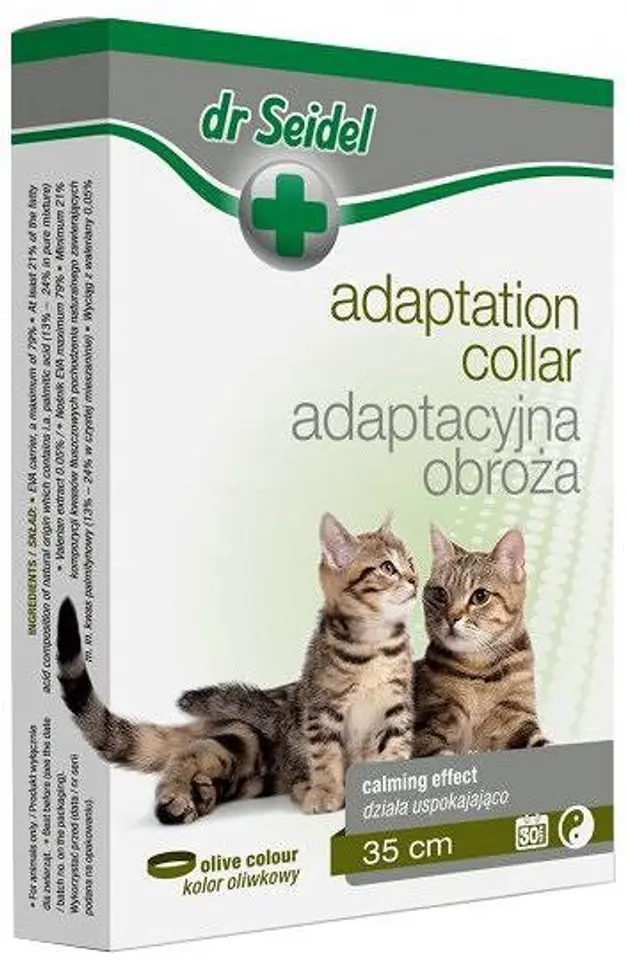 Obroża adaptacyjna dr Seidla to nowoczesny, wieloskładnikowy preparat z serii pomocy behawioralnych. Działa na koty uspokajająco i łagodząco. Zawiera kompozycję naturalnych substancji oddziałujących na zachowanie zwierząt podobnie jak feromony kocie. Kompozycja ta odpowiada znanej już od 1996 roku mieszaninie ujawnionej w patencie europejskim EP0724832. Zastosowanie obroży w trakcie terapii behawioralnej znacznie wspomaga jej proces. Zapewnia kotu poczucie bezpieczeństwa, sprzyja nauce i szybkiej adaptacji do nowych wyzwań.