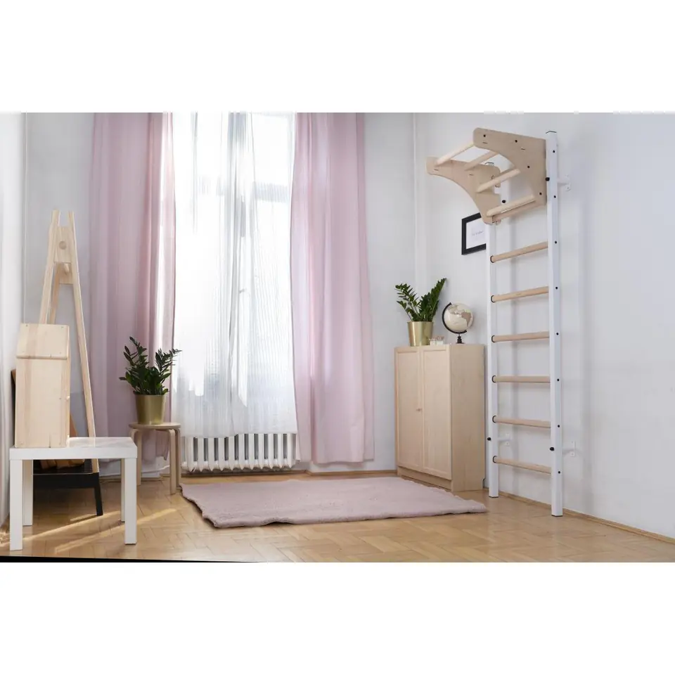 Wielofunkcyjna drabinka gimnastyczna to innowacyjne połączenie drewna i metalu. Świetnie sprawdzi się w każdym nowoczesnym wnętrzu, za sprawą starannie wyselekcjonowanego bukowego drewna wysokiej jakości oraz szlachetnej stali. Drabinka to gwarancja sprzętu wysokiej jakości oraz możliwości na większą aktywność ruchową. Kontrastowe zestawienie metalu z drewnem doskonale wpisuje się w aktualne trendy w wystroju wnętrz. Po zamontowaniu drabinka odstaje od ściany zaledwie na 15 cm. Zmieści się zatem w każdym, nawet niewielkim pomieszczeniu, stając się nie tylko inspiracją do codziennej aktywności, lecz także atrakcyjnym dodatkiem do jego aranżacji.Największą zaletą tego modelu jest jej nowoczesna konstrukcja i design, która jest bardziej wytrzymała w porównaniu ze zwykłą drewnianą drabinką, którą znamy z sal gimnastycznych. Parametry: • maksymalna waga użytkownika 120 kg• szerokość 0,67 m• wysokość 2,30 m• wysokość pomieszczenia do instalacji od 2,40 m• sposób mocowania - do ściany• waga 24 kg• kolor biały, drewno• materiał metal, drewno buk• gwarancja na metalowe elementy 10 lat• gwarancja na inne materiały 2 lata• produkt Polski• Seria BenchK 210 Model 211BZestaw zawiera:• drabinka gimnastyczna (8 bukowych szczebelków drewnianych o wymiarze 30x40 mm oraz 2 metalowe pionowe profile metalowe 40 mm x 50 mm)• zdejmowany drewniany drążek do podciągania• zestaw do montażu (oprócz kołków i wkrętów do ściany, które należy dobrać w zależności od rodzaju ściany do której drabinka gimnastyczna będzie mocowan?)Do drabinki można dokupić akcesoria dla dzieci: linę do wspinania z huśtawką oraz kółka gimnastyczne.