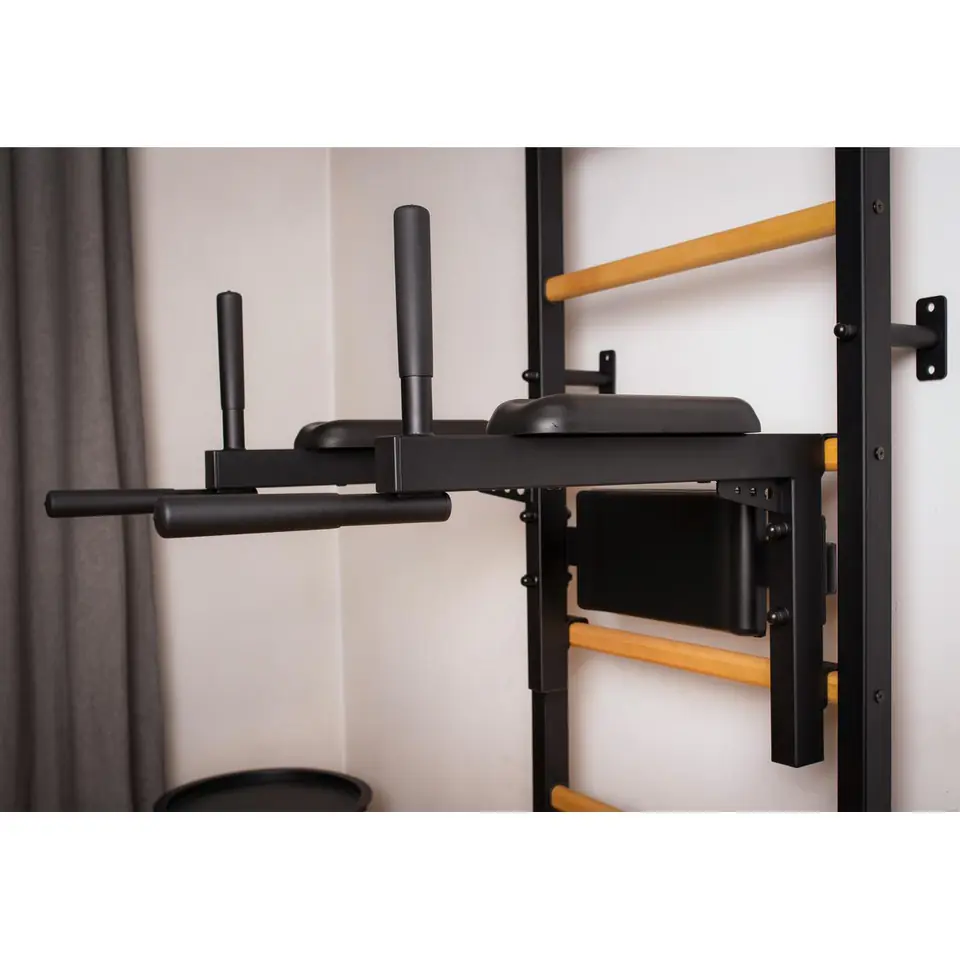 Drewniano – metalowa drabinka gimnastyczna z drążkiem, poręczą do ćwiczeń i ławeczką to solidna i praktyczna konstrukcja. Nie zajmuje dużo miejsca, jest przymocowana do ściany i odstaje na około 15 cm, dzięki czemu znakomicie sprawdzi się w każdym pomieszczeniu. Nowatorskie połączenie drewna z metalem idealnie komponuje się w aktualne trendy nowoczesnego wystroju wnętrza. Drabinka mocowana jest do ściany, z wykorzystaniem sześciu mocnych uchwytów. Profile boczne drabinki gimnastycznej zostały wykonane z metalu 40 x 50 mm o grubości stali – 2 mm. Metal wykorzystany w produkcji jest wysokiej jakości, a proszkowe malowanie zabezpiecza profile drabinki przed odpryskami, zarysowaniami czy zadrapaniami wynikłymi z użytkowania drabinki i kontaktu z osprzętem. Amortyzacja w kształcie litery T uchwytów do ściany skierowana jest na duże obciążenia, nawet do 150 kg osoby ćwiczącej na drabince gimnastycznej. Szczebelki wykonane są z drewna bukowego, są one ręcznie olejowane co zapobiega ślizganiu się dłoni podczas wykonywania ćwiczeń na drabince gimnastycznej. Chroni to także drabinkę przed szybką eksploatacją w postaci śladów, otarć czy zabrudzeń. Najważniejszą zaletą drabinki jest jej wytrzymałość. Drabinka jest w stanie wytrzymać obciążenie sięgające nawet do 150 kilogramów. Jest to szczególnie ważny aspekt dla użytkowników o większej wadze ciała. Drabinkę sportową można wykorzystywać nie tylko w salach gimnastycznych i siłowniach.Zestaw zawiera:• drabinka gimnastyczna (9 bukowych szczebelków drewnianych o wymiarze 30x40 mm• montowanego na stałe drążka do podciągania z sześcioma antypoślizgowymi uchwytami• poręcz do ćwiczeń z podłokietnikami i podkładem pod plecy, wykonanych z integralnego poliuretanu• zestaw do montażu (oprócz kołków i wkrętów do ściany, które należy dobrać w zależności od rodzaju ściany do której drabinka gimnastyczna będzie mocowana)• ławka z dodatkowymi siedziskiem i dodatkowymi rolkami pod kolanaParametry:• maksymalna waga użytkownika 150 kg• szerokość 0,67 m• wysokość 2,40 m• wysokość pomieszczenia do instalacji 2,50 m• sposób mocowania - do ściany (6 uchwytów)• waga 57 kg• kolor czarny mat (metalowe elementy) oraz drewno• materiał metal, drewno buk kolor dębu• gwarancja na metalowe elementy 10 lat• gwarancja na inne materiały 2 lata• produkt Polski wyprodukowany zgodnie z normami PN-EN 12346:2001 i PN-EN 913:2008• Seria BenchK 310 Model 313B