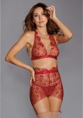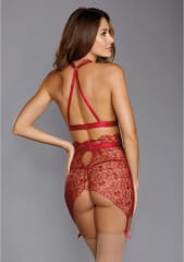 - Komplet zawiera: biustonosz halter, pas-spodniczkę z podwiązkami, stringi