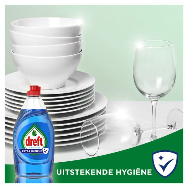 Unikalna, eukaliptusowa formuła zapewnia nie tylko przyjemny, świeży zapach, ale również dodatkową higienę: chroni gąbki i szczotki do naczyń przed rozwojem bakterii nawet do 24 godzin. Dreft Extra Hygiene sprawia, że mycie naczyń staje się skuteczne, bezpieczne i przyjemne dla całej rodziny.