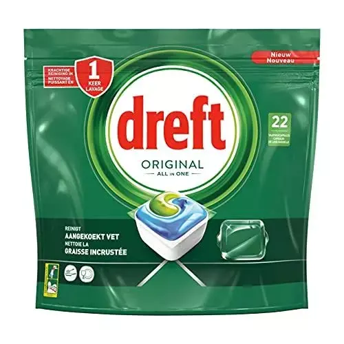 Kapsułki do zmywarki Dreft Original All in One mają najlepsze działanie czyszczące, a ich formuła usuwa nawet zaschnięty tłuszcz. Dreft Original łączy płyn i proszek w jednej potężnej kapsułce. Ultrarozpuszczalne opakowanie kapsułek rozpuszcza się znacznie szybciej niż twarde tabletki, więc natychmiast zaczynają działać, aby wykonać zadanie. Ponadto są niezwykle przyjazne dla użytkownika. Po prostu włóż je do zmywarki. Z opakowaniem, więc bez odpadów. Używaj również płynu do mycia naczyń Dreft w zlewie. Skoncentrowana formuła natychmiast usuwa tłuszcz i nadaje olśniewający połysk. Moc czyszczenia naczyń, na której możesz polegać.