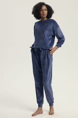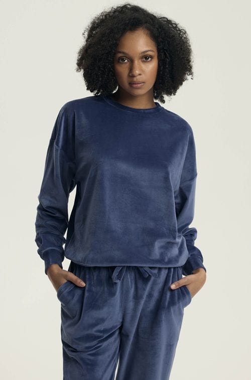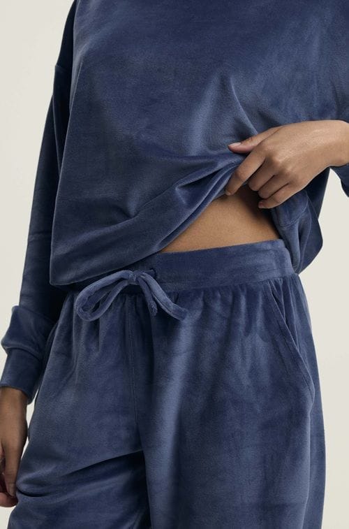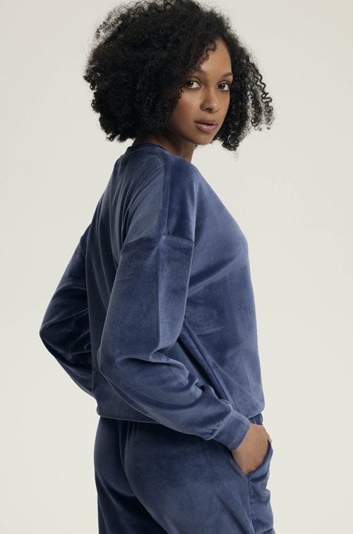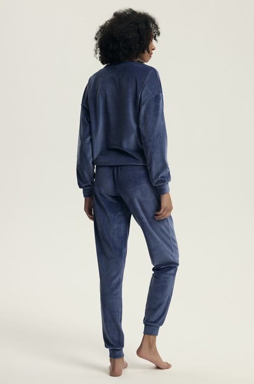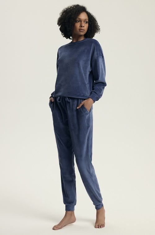 Welurow, luźny i wygodny dres damski. Bluza z długim rękawem i okrągłym dekoltem. Spodnie długie, jednolite. Dół bluzy, rękawy oraz nogawki zakończone ściągaczem. Skład: 95% poliester 5% elastan.
