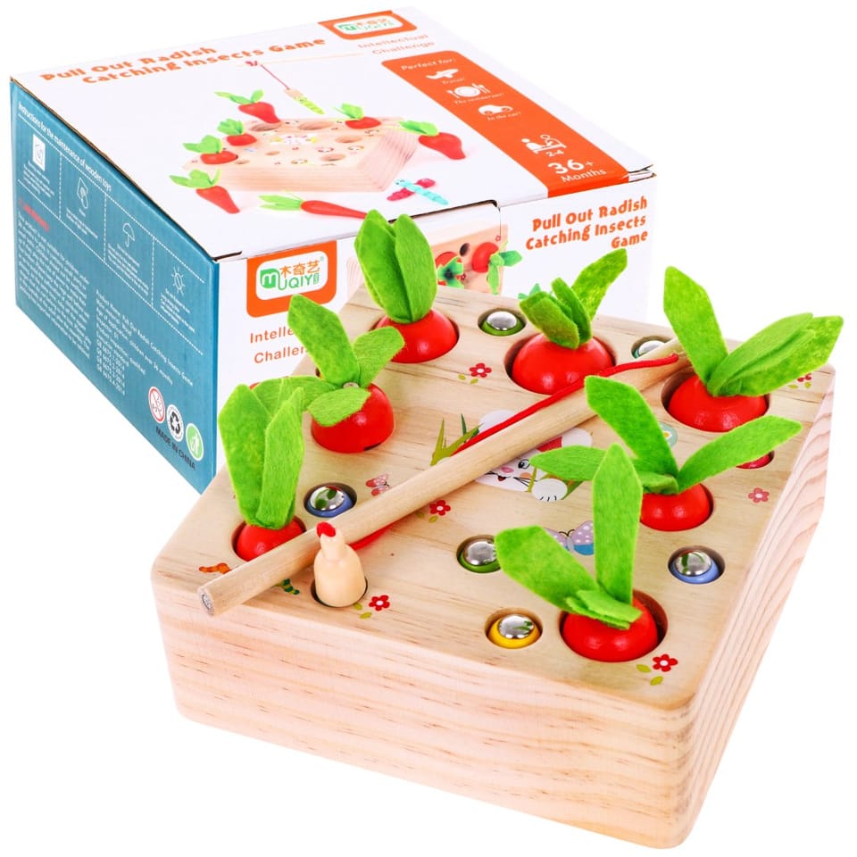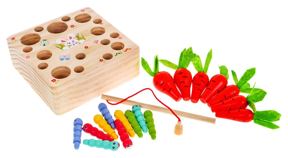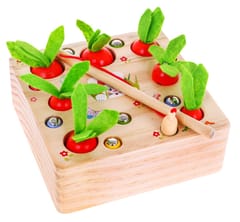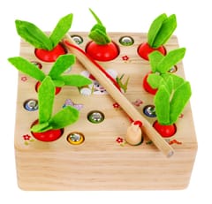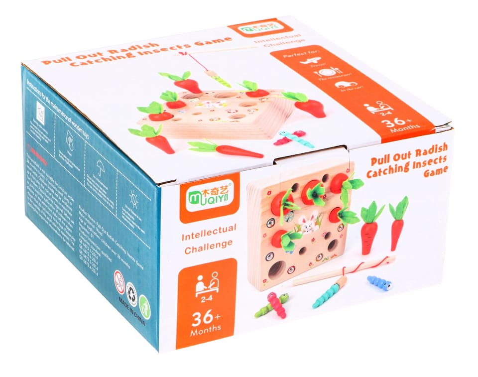 | Zabawka przeznaczona jest dla dzieci od 3-go roku życia. Wykonana została w całości z drewna, pomalowana bezpiecznymi, nietoksycznymi farbami w żywych kolorach które przyciągają uwagę dziecka i zachęcają do zabawy. Gra wspiera rozwój intelektualny i zręcznościowy. Dziecko musi dopasować różnej wielkości marchewki i robaczki do odpowiednich otworów. Robaczki zakończone są magnesami a do zestawu dołączona jest drewniana wędka również z magnesem. Grać można samemu lub w grupie. Należy usunąć wszystkie robaczki za pomocą wędki, tak by nie zagrażały rosnącym marchewkom, a potem pozbierać marchewki. | |