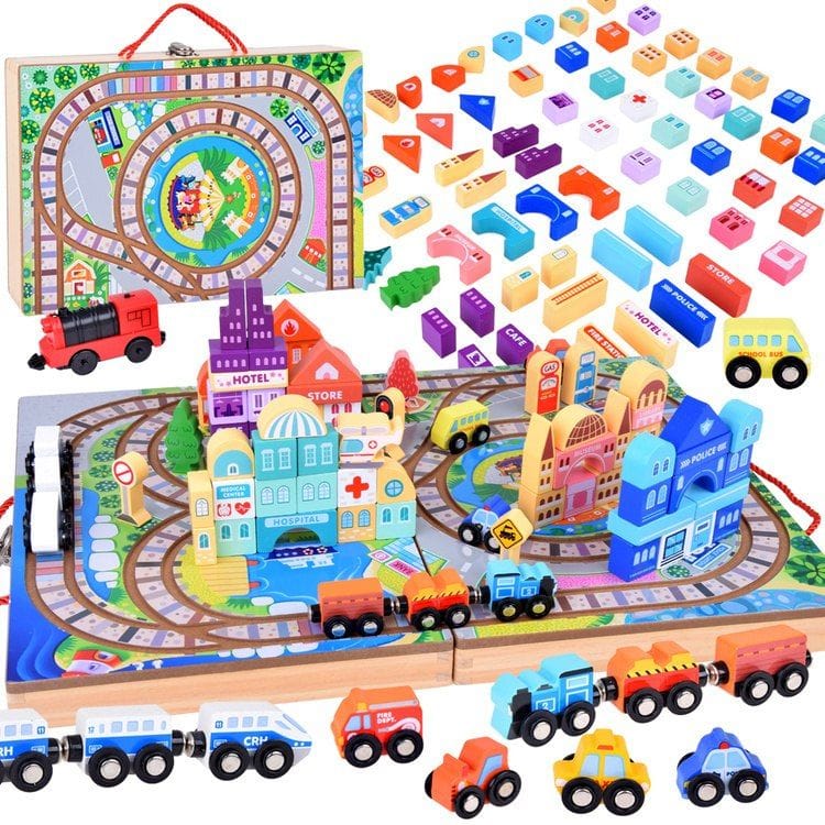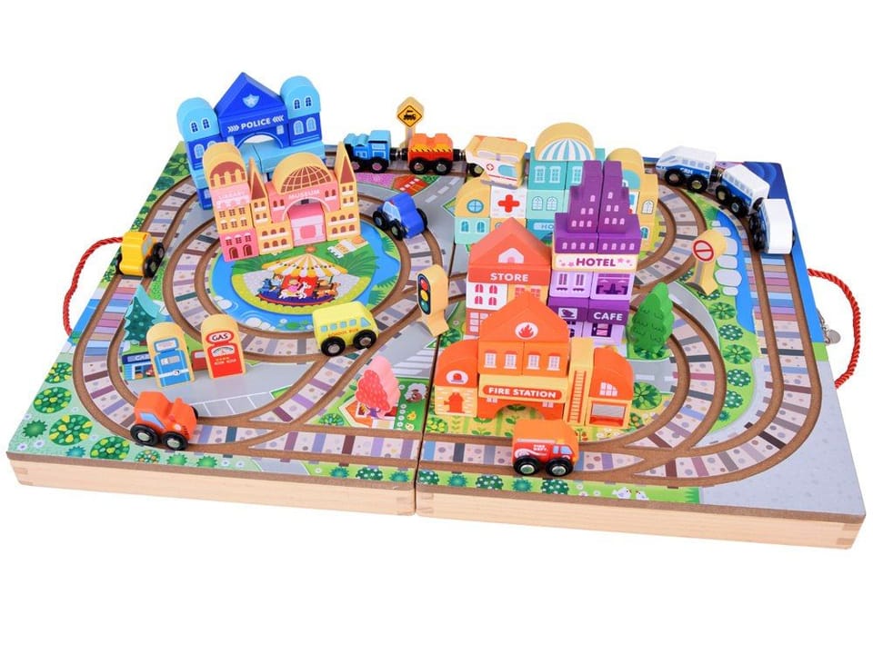 Drewniana Kolejka - Zestaw Klocków Miasto z Pociągiem i Torami 89 elementów