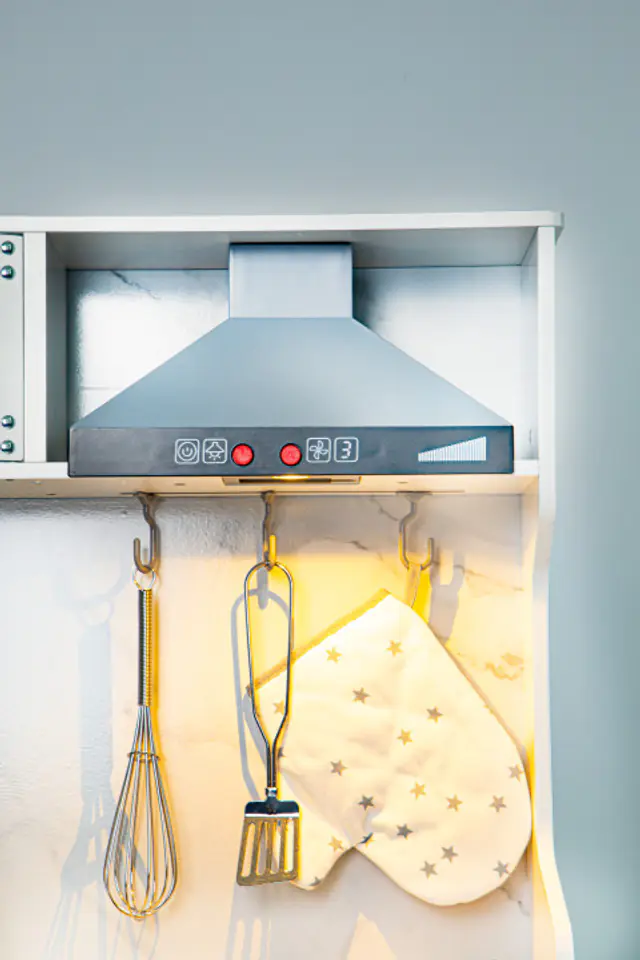 - Jak w prawdziwej kuchni nad palnikami znajduje się okap, który posiada podświetlenie oraz wydaje charakterystyczny dźwięk pracującego wentylatora.