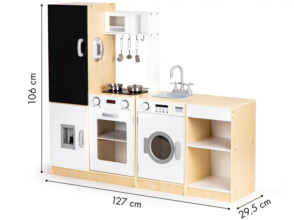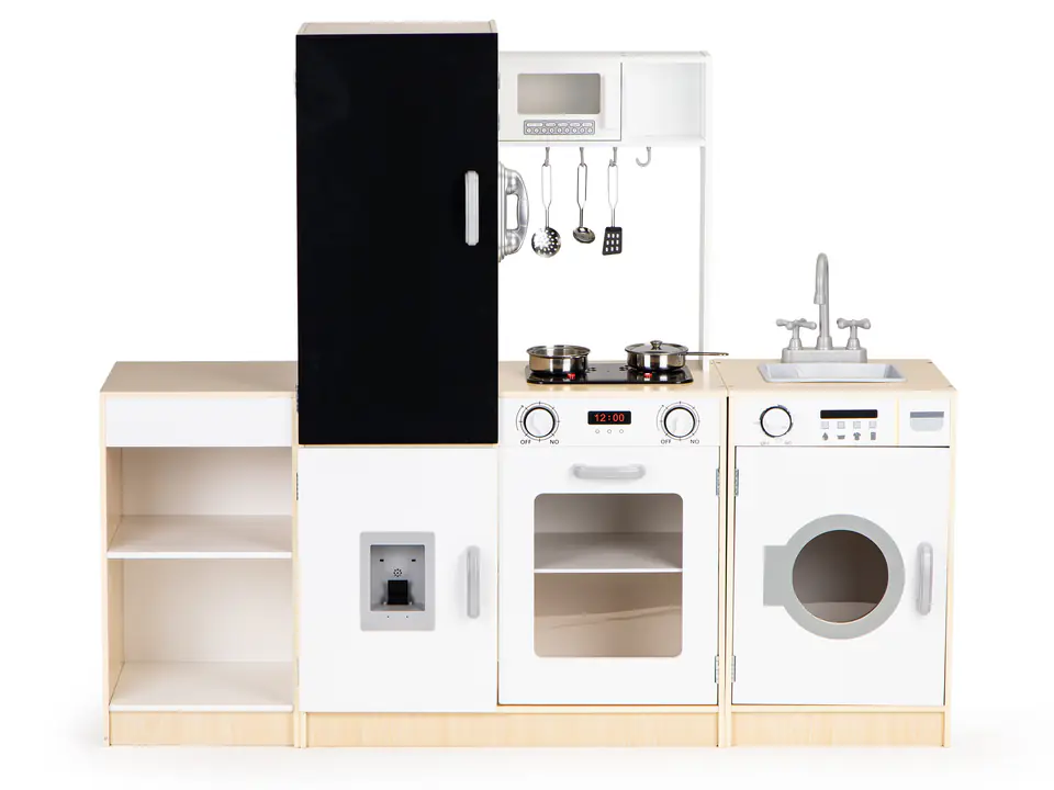 Mały kucharz może równocześnie piec, gotować oraz podgrzewać danie w mikrofali. Po skończonym gotowaniu wszystkie naczynia można umyć w pojemnym zlewie i odstawić przybory na swoje miejsca.