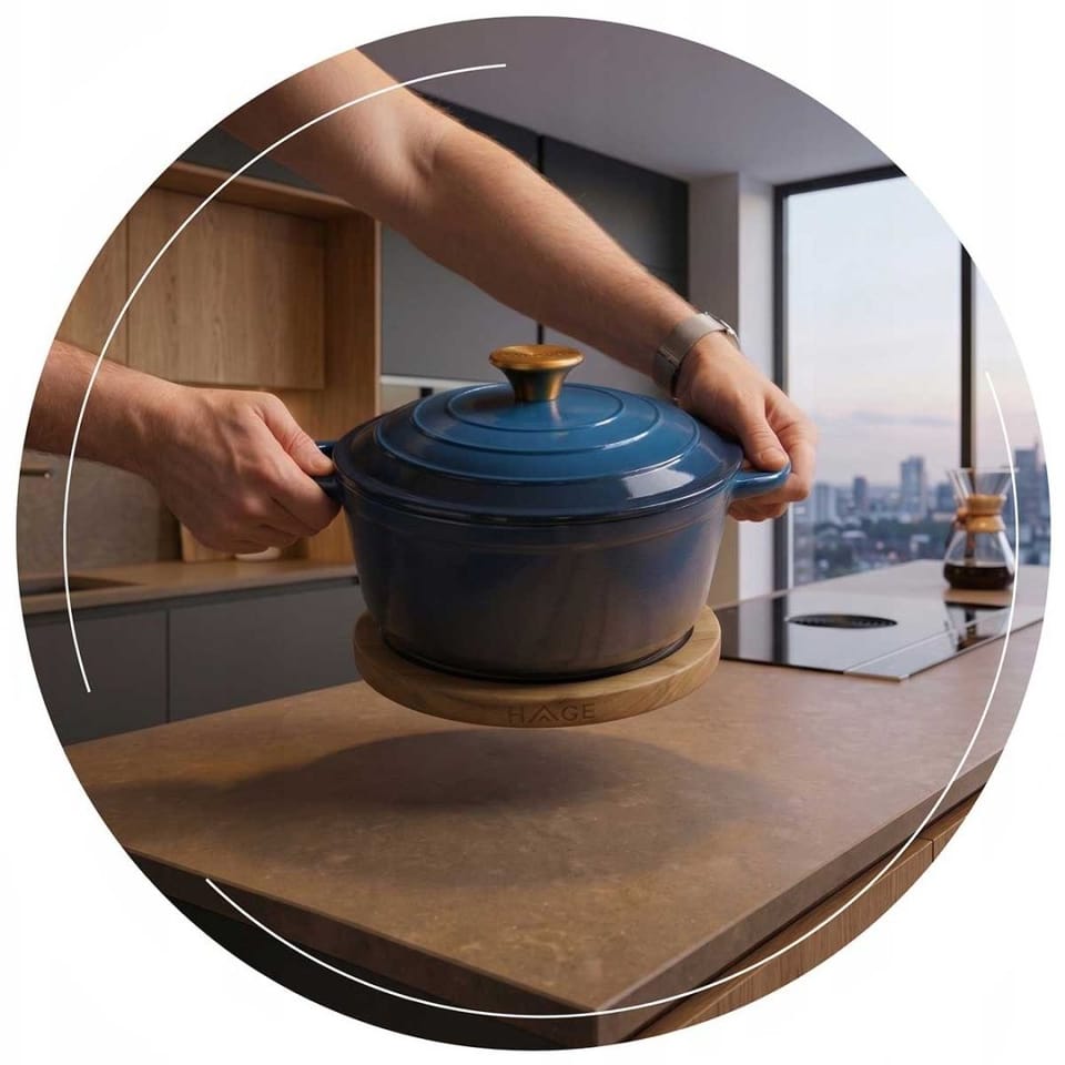 System ukrytych magnesów: Podkładka pewnie przywiera do naczynia, umożliwiając jego wygodne i bezpieczne przenoszenie prosto na stół.