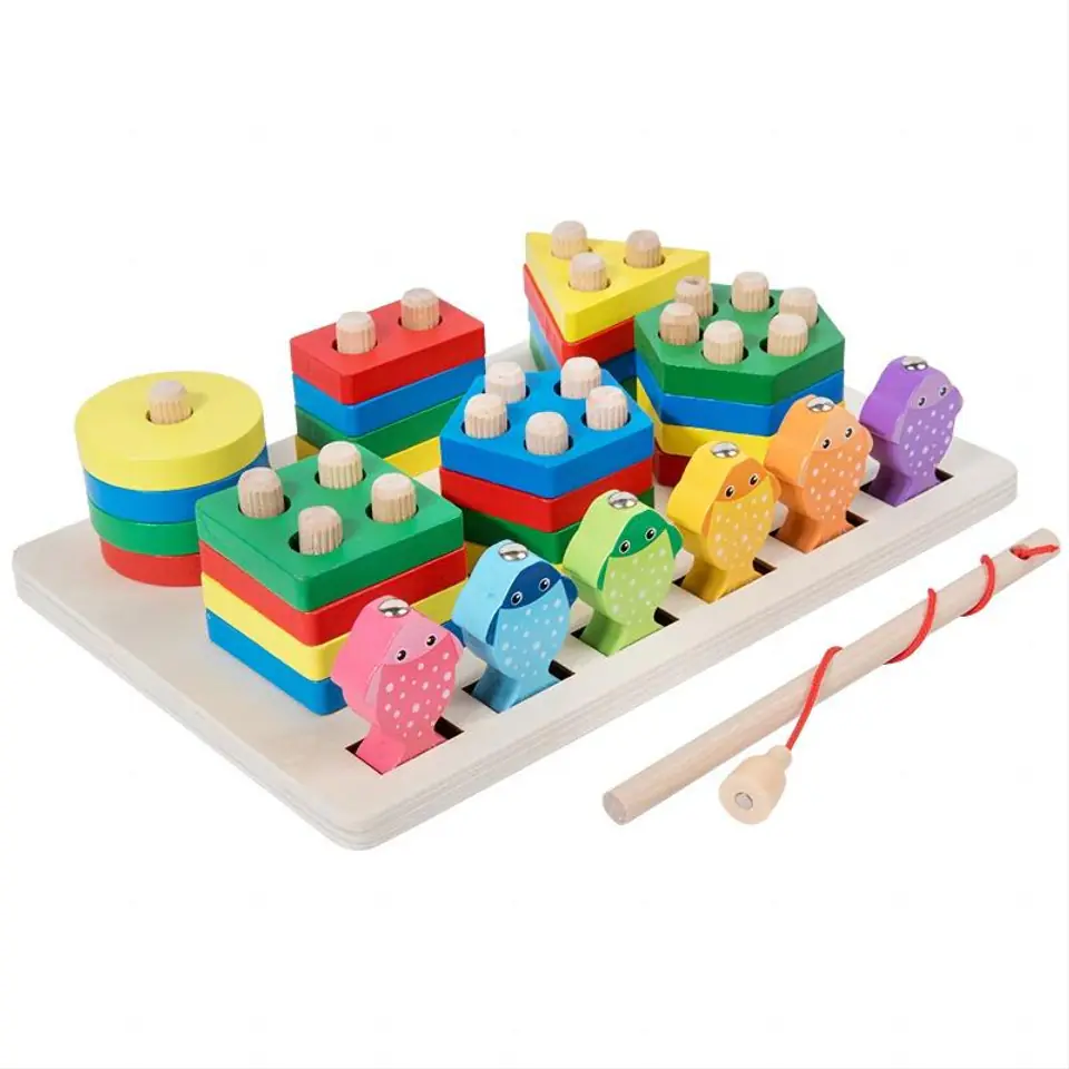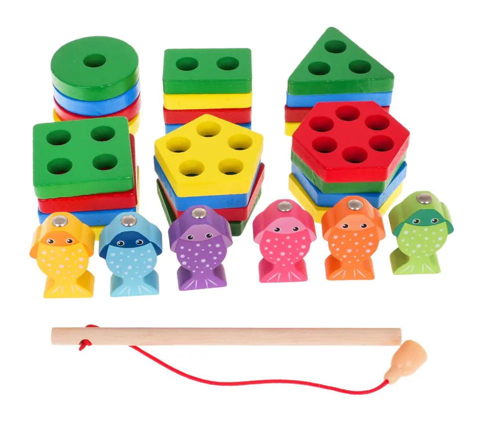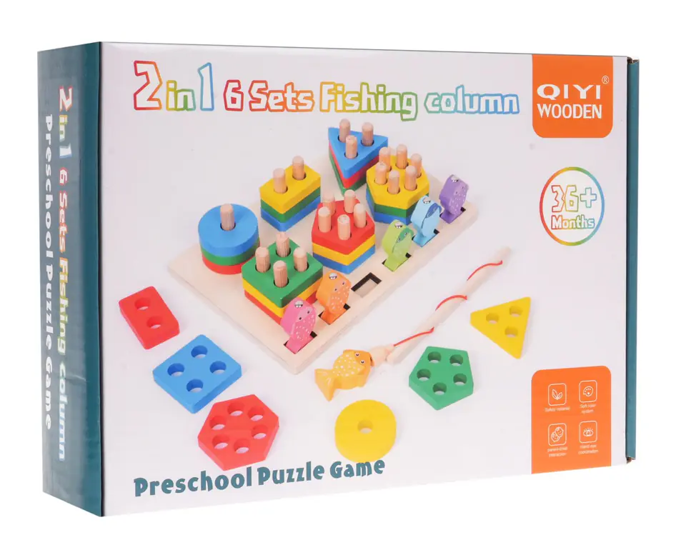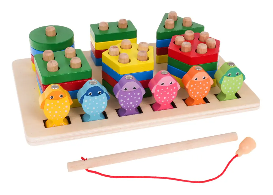 Zestaw 2 w 1, drewniana układanka i łowienie rybek to propozycja dla dzieci od 3-go roku życia. Zestaw składa się z drewnianej podstawy, na której znajdują się paliki oraz prostokątne wgłębień. Na palikach umieszczamy kolorowe klocki o zaokrąglonych końcach, w różnych kształtach, a we wgłębieniach rybki. Do ułożenia są różnokolorowe figury geometryczne takie jak kółko, prostokąt, trójkąt, kwadrat, pięciokąt oraz sześciokąt. Kółko posiada jeden otwór, prostokąt - dwa, trójkąt - trzy, kwadrat - cztery, pięciokąt - pięć a sześciokąt - sześć. Zadaniem malucha jest umiejętne dopasowanie określonej figury do danej ilości palików. Dodatkowo na planszy znajduje się gra z łowieniem rybek. Gra polega na umieszczeniu rybek z magnesami w prostokątnych otworach za pomocą wędki na magnes. Zestaw idealnie nadaje się do rozwoju sprawności manualnej, ćwiczy koordynację ruchową, dotykową i wzrokową malucha. Dziecko rozwija wyobraźnię i pobudza kreatywność.