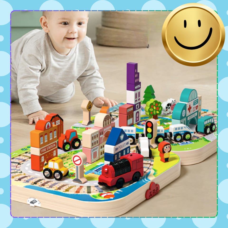 Drewniana Skrzynka dla Dzieci – Rozkładane Miasteczko z Lokomotywą i Dodatkami!✅