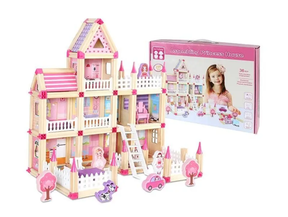 | Zestaw drewnianych, kolorowych i bezpiecznych klocków dla dzieci od 3-go roku życia. Pakiet składa się z 298 elementów, które po ułożeniu tworzą drewniane domki dla księżniczek. Prócz elementów konstrukcyjnych w zestawie znaleźć możemy również klocki w kształcie drzewa, z postaciami księżniczek, czy autami, jest też obrazkowa instrukcja. | |