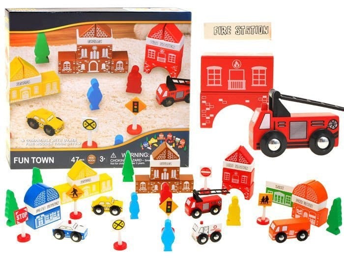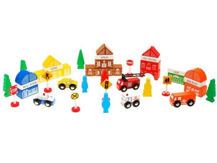 Przedstawiamy niezwykłe drewniane klocki. Zestaw składa się z 47 elementów, z których można zbudować całe miasteczko: znajdzie się tu remiza strażacka, szkoła, bank, kościół ale też pojazdy: karetka, taxi, wóz policyjny a nawet drzewa i postacie. Klocki wykonane są starannie i z dbałością o szczegóły. Kolorowe klocki przyciągają uwagę i zachęcają do zabawy. Drewniane klocki są solidne, będą długo służyły dziecku i zapewnią mu wiele godzin zabawy. Wykonane z naturalnych surowców, są w pełni ekologiczne. Zabawa takimi klockami posiada wiele zalet:-stymuluje zmysł wzroku: dziecko uczy się rozróżniania kolorów i wzorów,-uczy kreatywności, myślenia przestrzennego,-stymuluje wyobraźnię dziecka.