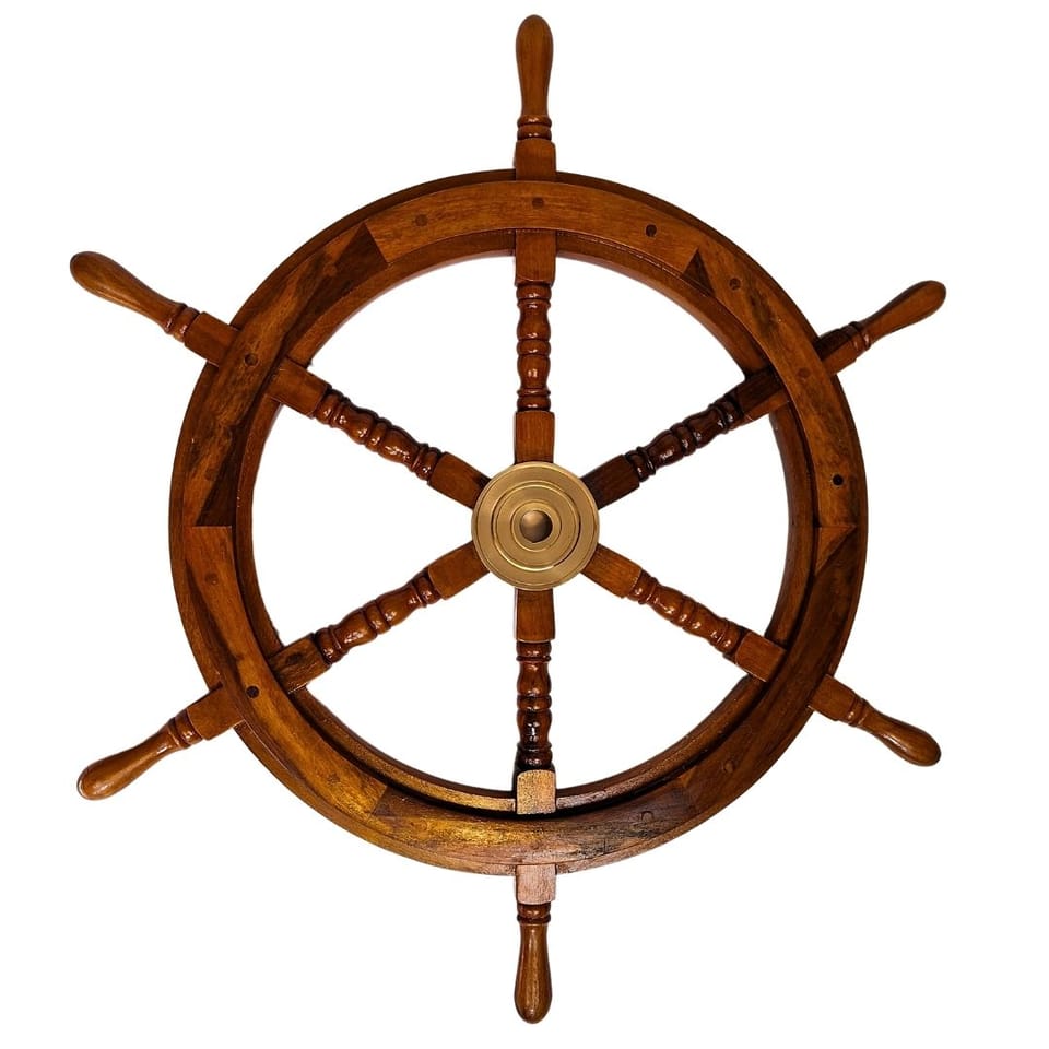 Drewniane koło sterowe - wkład mosiężny z miejscem na klin - średnica 75cm Symbol przywództwa, siły i kierunku – doskonały jako prezent dla szefa, lidera, miłośnika morza lub żeglarza. Wykonane z wysokiej jakości drewna z mosiężnym wkładem z miejscem na klin, zachwyca detalami i solidnością wykonania. Specyfikacja: • Materiał: Drewno • Wkład: Mosiężny (z miejscem na klin) • Średnica: 75 cm • Styl: Marynistyczny, retro • Model: SW2/30 Dlaczego warto? • Efektowny rozmiar – aż 75 cm średnicy! • Klasyczny styl retro / marynistyczny • Świetnie komponuje się z bielą, granatem, zielenią • Trwałe i eleganckie – drewno + mosiądz Idealne jako: • Prezent dla szefa lub lidera • Upominek dla żeglarza lub fana morza • Dekoracja do gabinetu, salonu lub restauracji • Element wystroju w stylu morskim