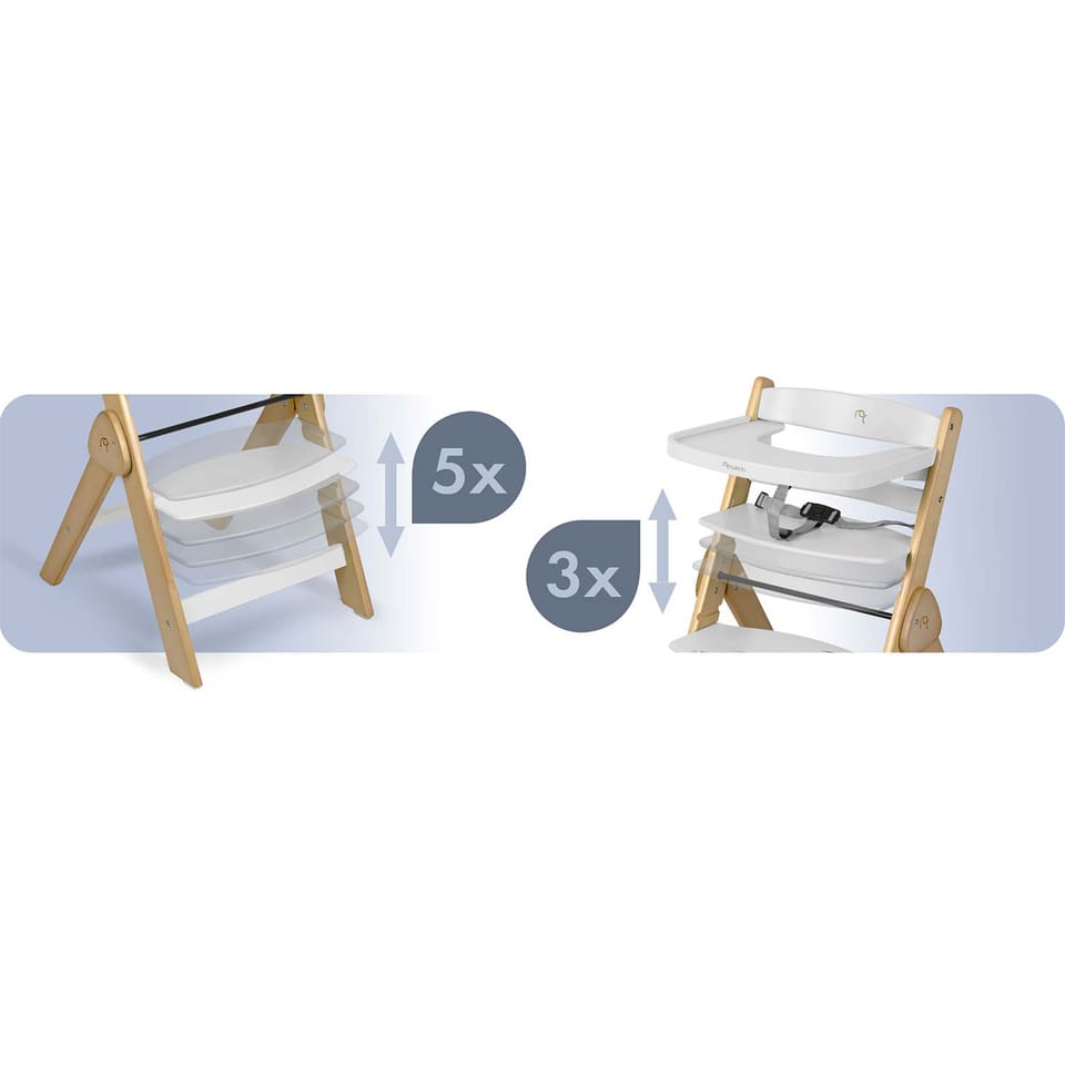 Kiedy Twoje dziecko rośnie, krzesełko ewoluuje! Wystarczy zdjąć tackę i dopasować wysokość siedzenia i oparcia na nogi a krzesełko zmienia się w idealne miejsce do jedzenia przy rodzinnym stole. Stabilne, ergonomiczne i zawsze na właściwej wysokości.
