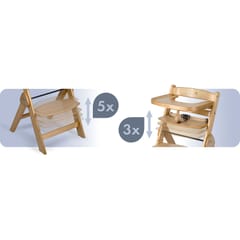 Kiedy Twoje dziecko rośnie, krzesełko ewoluuje! Wystarczy zdjąć tackę i dopasować wysokość siedzenia i oparcia na nogi a krzesełko zmienia się w idealne miejsce do jedzenia przy rodzinnym stole. Stabilne, ergonomiczne i zawsze na właściwej wysokości.