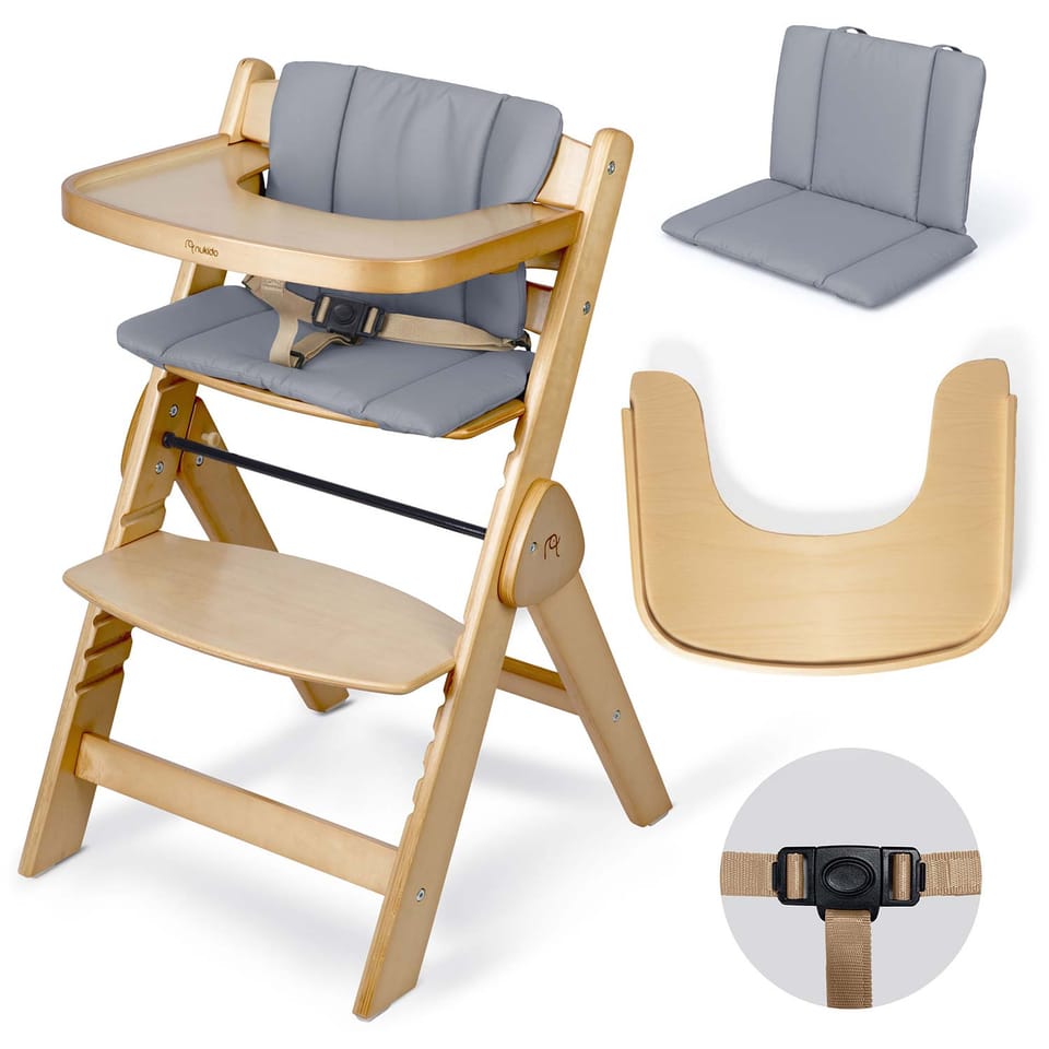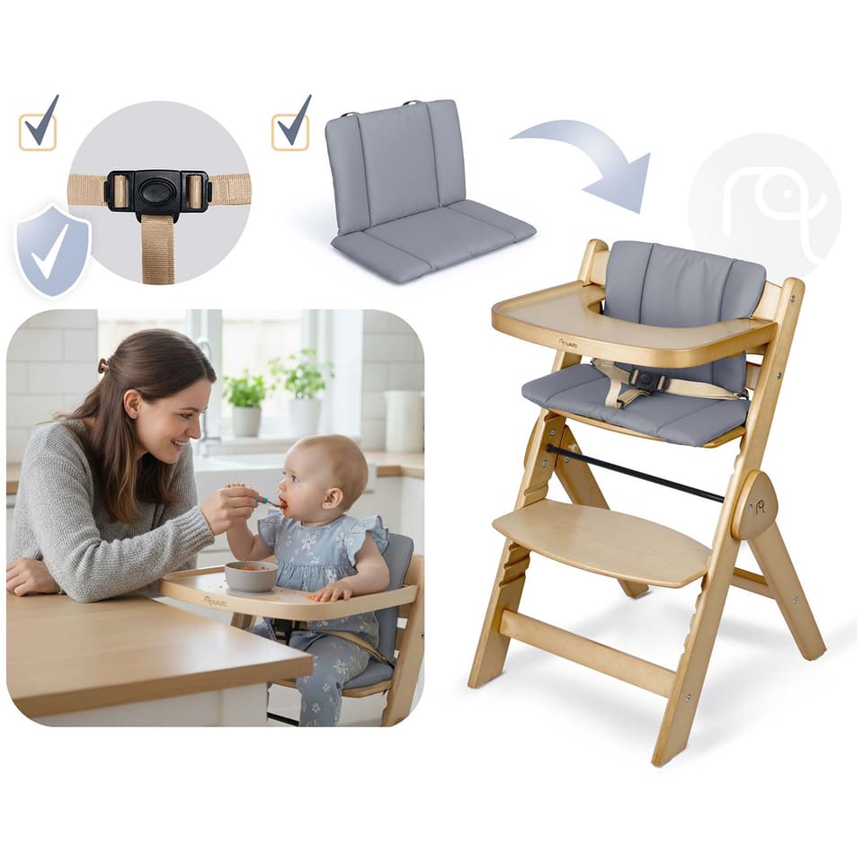 Dzięki specjalnemu zestawowi z pasami bezpieczeństwa i wygodną poduszką staje się bezpiecznym i komfortowym pierwszym krzesełkiem dla Twojego maluszka. Idealne do pierwszych posiłków i wspólnych chwil przy stole.
