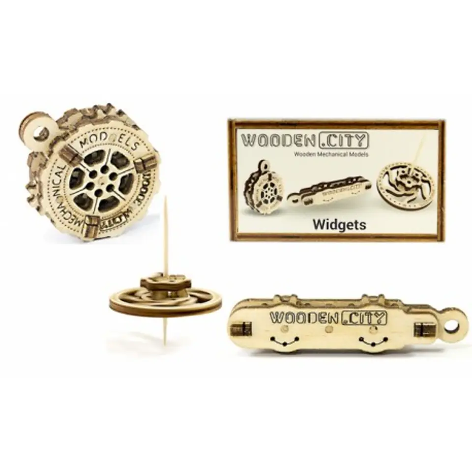 Drewniane puzzle mechaniczne 3D Wooden.City - Gadżety Drewniane modele Wooden.City to nowoczesna forma Puzzli 3D do samodzielnego montażu bez użycia dodatkowych narzędzi oraz kleju. Zestaw gadżetów to wspaniały prezent dla każdego miłośnika układanek. Charakterystyka materiał - ekologiczna sklejka brzozowa wyprodukowane w Polsce elementy wykonane z dbałością o szczegóły złożenie nie wymaga użycia dodatkowych narzędzi i kleju w zestawie do złożenia dwa breloczki z ruchomymi kołami zębatymi oraz bączek świetnie sprawdzą się jako prezent również dla dorosłych czas składania to ok. 30 minut W zestawie opakowanie (drewniana skrzyneczka) 29 elementów różnej wielkości Wymiary złożonych modeli breloczek: ok. 6,3x1,1x0,9cm breloczek: ok. 3,8x2,8x0,6cm bączek: ok. 5x6,5cm waga: ok. 0.05kg Wymiary opakowania długość: 10,6cm szerokość: 5,9cm wysokość: 1,7cm Model przeznaczony dla dzieci powyżej 14 roku życia. WR 305