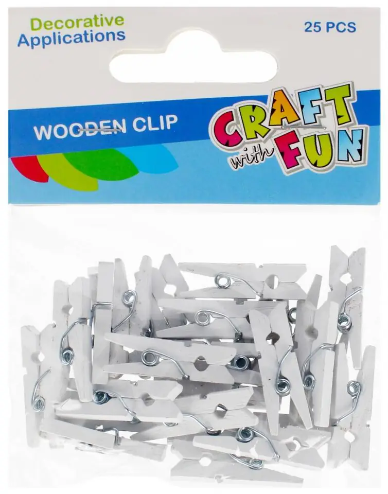 Zalety produktu: idealne do przyczepiania zdjęć, obrazków oraz wszelkiego rodzaju kartek, doskonałe do wykonywania dekoracji metodą scrapbooking oraz rękodzieł, spinacze można dowolnie malować oraz zdobić. Używaj tego produktu w połączeniu z innymi akcesoriami oraz kompletami z serii CRAFT WITH FUN Zawartość opakowania: 25 szt. spinaczy w białym kolorze. Produkt wykonany z drewna. Wymiary/waga: wymiary opakowania szer. x wys. cm : 8x11, waga produktu w opakowaniu kg : 0,01 kg. Zestaw przeznaczony dla dzieci w wieku: 3 . Pakowany w woreczek z zawieszką. W inerze po 12 szt. W kartonie zbiorczym po 144 szt.