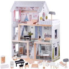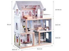 Drewniany domek dla lalek z mebelkami to bardzo stylowa willa w stylu boho. Trzy kondygnacyjna willa posiada cztery przestronne pomieszczenia, taras, schody.Kolorystyka domku jest bardzo stonowana, stylowa, zachęcająca do mieszkania. Meble w pomieszczeniach zachowane są w biało drewnianej kolorystyce, co jeszcze bardziej podkreśla stylowość pomieszczeń. Przestronne pomieszczenia zostały oświetlone spokojnym światłem led. W takiej willi każdy będzie czuł się komfortowo.