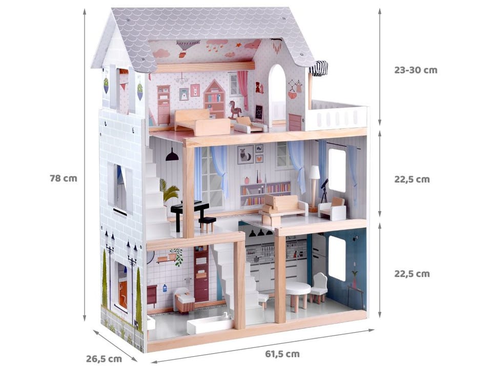 Pomieszczenia w domku:Parter:- przestronna kuchnia z miętową ścianą podkreślającą białe meble kuchenne- stylowa biała łazienka z wanną, prysznicem, toaletką, wc- białe schody prowadzące na piętroPiętro:- pokój dzienny z czytelnią i obserwatorium połączony z pokojem melomana, gdzie można ustawić czarny fortepian- schody prowadzące na poddaszePoddasze:- uroczy pokój dziecięcy z przecudną grafiką chmurek, gwiazd, balona na suficie, z pokoju można wyjść na okazały taras.W pokoju dziecięcym znajduje się także wigwam, konik na biegunach, wesołe obrazki ze zwierzątkami, półeczki no po prostu pokój jest uroczy.- przestronny taras z pudrowo różową podłogą, zachęci do odpoczynku na leżaku pod parasolemW każdym pomieszczeniu znajduje się okno, dzięki któremu można wyglądać na zewnątrz i podziwiać widoki. Zewnętrzna elewacja domu ozdobiona jest w tuje, kwiaty, kwiatki w donicach, latarnie. Ten dom spełni oczekiwania każdej dziewczynki, która marzyła o własnym domku dla lalek.