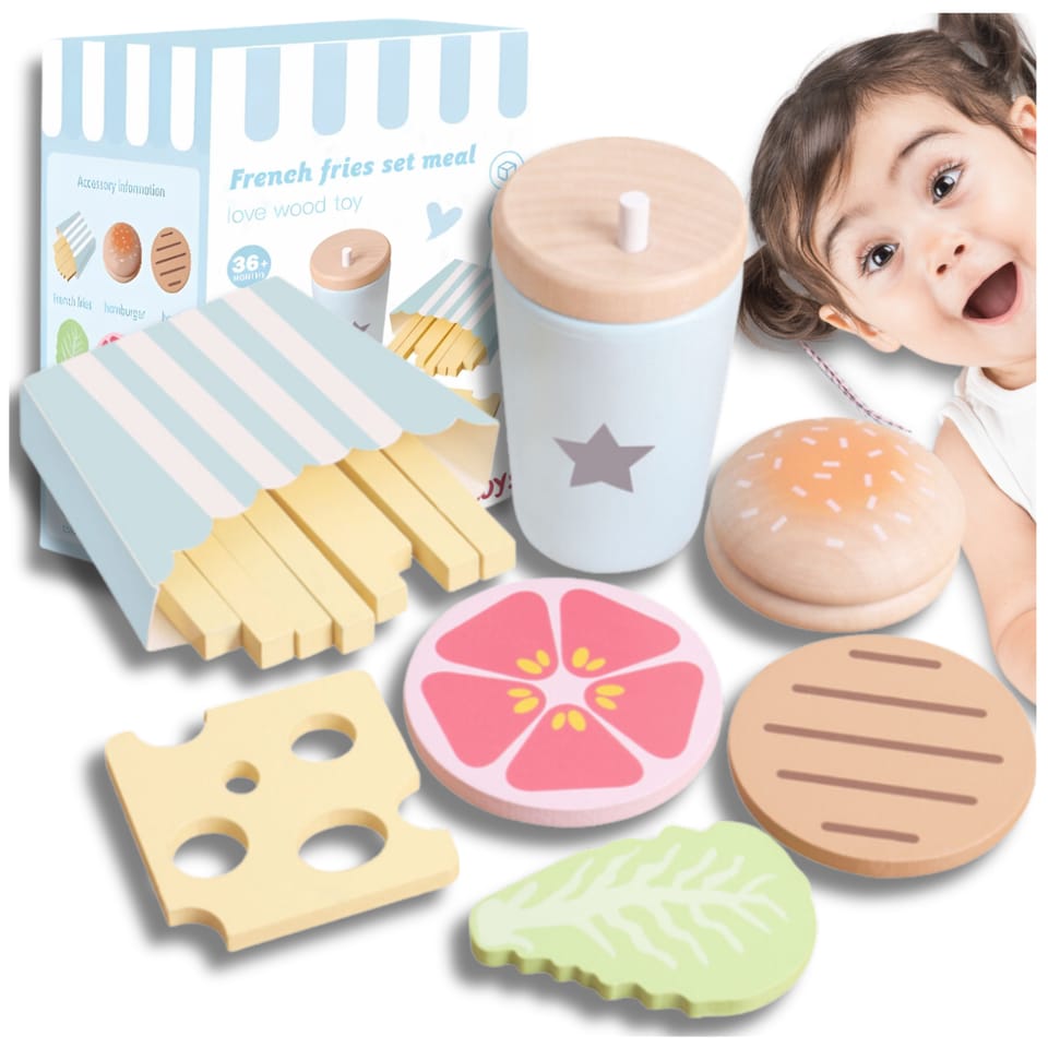 ⭐️Drewniany Duży Zestaw Hamburger dla Dzieci Zabawka Edukacyjna Frytki Napój