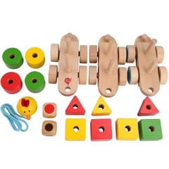Drewniany pociąg z kurczaczkiem - kształty i kolory W zestawie 3 wagoniki z kołeczkami na klocki 12 klocków o różnych kształtach i kolorach 2 kostki z kolorami i kształtami klocków sznureczek do ciągnięcia pociągu pudełko Wymiary opakowania: 45 x 10 x 13cm wielkość zabawki: wagonik 16,5cm x 9cm x 10cm, długość sznurka 67cm, klocki około 4cm Zabawka przeznaczona dla dzieci od 3 roku życia. Posiada atest CE. LL208