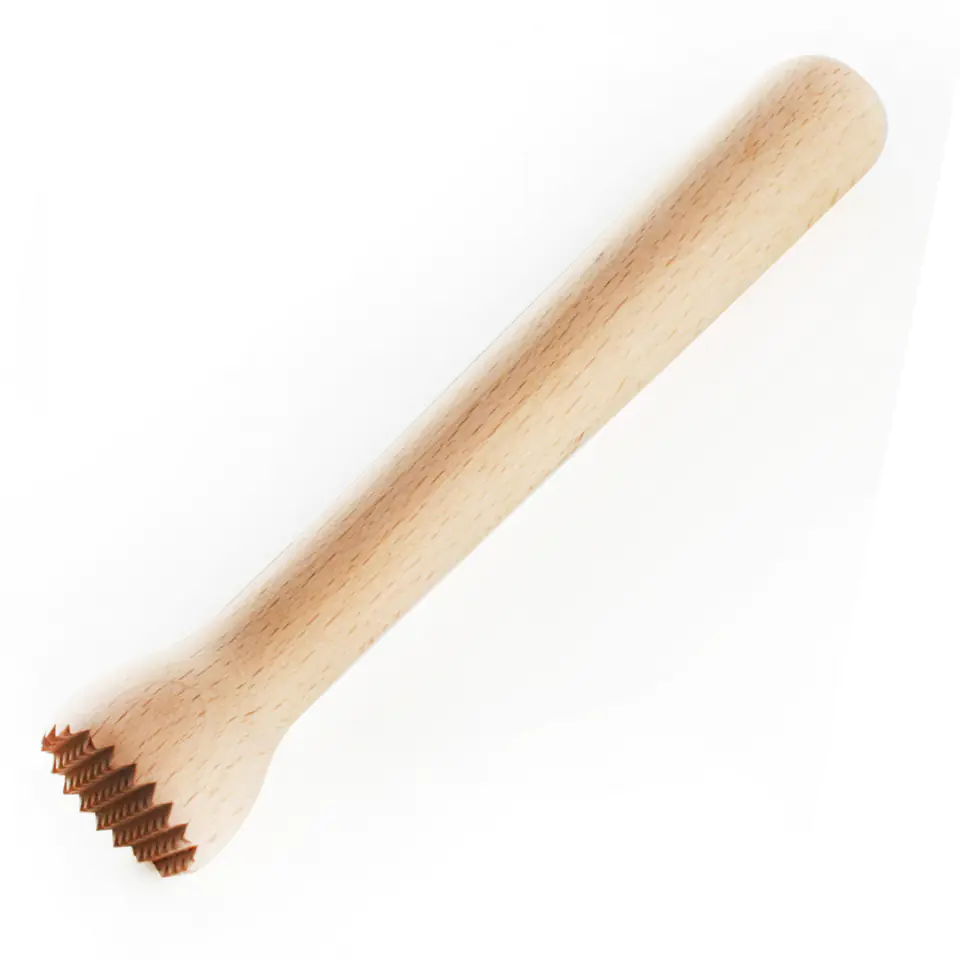 Tłuczek barmański o długości 22 cm i średnicy 3 cm. Wykonany w całości z drewna bukowego. Zakończony ząbkami. Jest niezwykle solidny oraz wygodny w użytkowaniu, dzięki wyprofilowanej rączce. Idealny do przygotowania napojów, drinków np. mohito. Wykorzystamy go również w kuchni do rozdrabniania orzechów, czekolady, ziół oraz leków. Tłuczek barmański wykorzystają zarówno profesjonaliści, jak i osoby początkujące, które w zaciszu domowym chcą przygotować sobie ulubionego drinka na bazie, ziół, cukru czy cytrusów. Odpowiednio użytkowany posłuży nam długie lata, muddler nie nadaje się do mycia w zmywarce do naczyń.