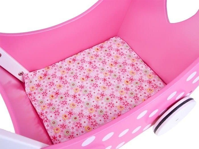 W zestawie znajduje się także miękkie prześcieradło, dzięki któremu laleczkom i misiom będzie się wygodnie leżało. Kółka wózeczka są antypoślizgowe. Zostały wyposażone w gumowe opaski, dzięki którym wózek będzie miał lepszą przyczepność do podłoża i nie spowoduje zarysowań na podłodze.