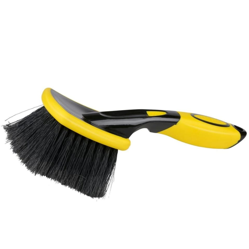 - Szczotka do kół (ok. 25 × 9 cm): wyprofilowana konstrukcja ułatwia usuwanie błota, piasku i kurzu z opon oraz obręczy; ergonomiczny uchwyt zapewnia pewny chwyt.
