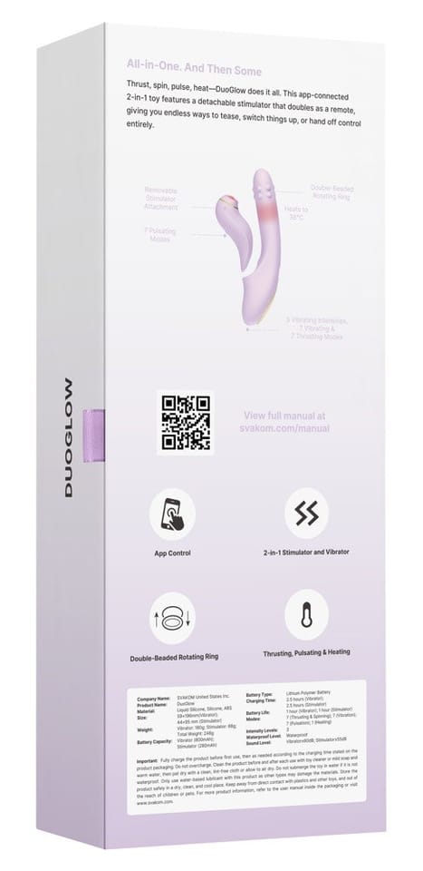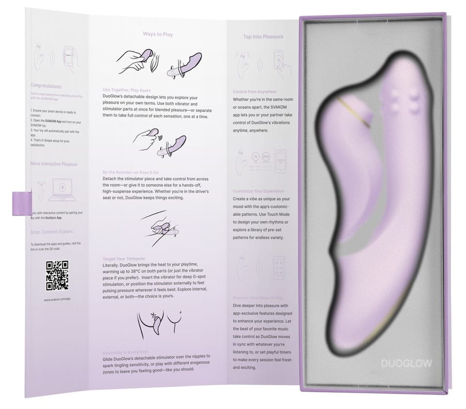 Svakom DuoGlow fioletowy – innowacyjne urządzenie intymne 2w1 z aplikacjąZanurz się w świecie zaawansowanej technologii i nowoczesnego wzornictwa z modelem Svakom DuoGlow w eleganckim, fioletowym kolorze. To wielofunkcyjne urządzenie intymne łączy w sobie dwie funkcje – może być używane jako jeden zintegrowany system lub z odłączanym elementem, ktory działa niezależnie. Całość została zaprojektowana z myślą o maksymalnej wygodzie użytkowania oraz dyskretnej, nowoczesnej estetyce.Zaawansowana technologia sterowaniaDzięki dedykowanej aplikacji Svakom możesz w pełni zarządzać funkcjami urządzenia bezpośrednio z poziomu smartfona. Swobodnie wybieraj tryby pracy, poziomy intensywności i aktywuj podgrzewanie – zarowno podczas użytkowania solo, jak i z partnerem na odległość.Personalizacja i komfortModel DuoGlow wyposażono w 7 rytmow pulsacji oraz 3 poziomy wibracji, co pozwala na szeroki zakres ustawień dostosowanych do własnych potrzeb. Ergonomicznie zakrzywiony kształt doskonale dopasowuje się do ciała, umożliwiając precyzyjne skierowanie działania. Innowacyjna funkcja podgrzewania zapewnia przyjemne uczucie naturalnego ciepła.Wysoka jakość wykonaniaProdukt wykonano z wysokiej klasy materiałow, ktore są bezpieczne dla skory, łatwe w czyszczeniu i trwałe. Całość jest wodoodporna, co zwiększa komfort użytkowania i możliwości pielęgnacji.Podstawowe cechy produktu: