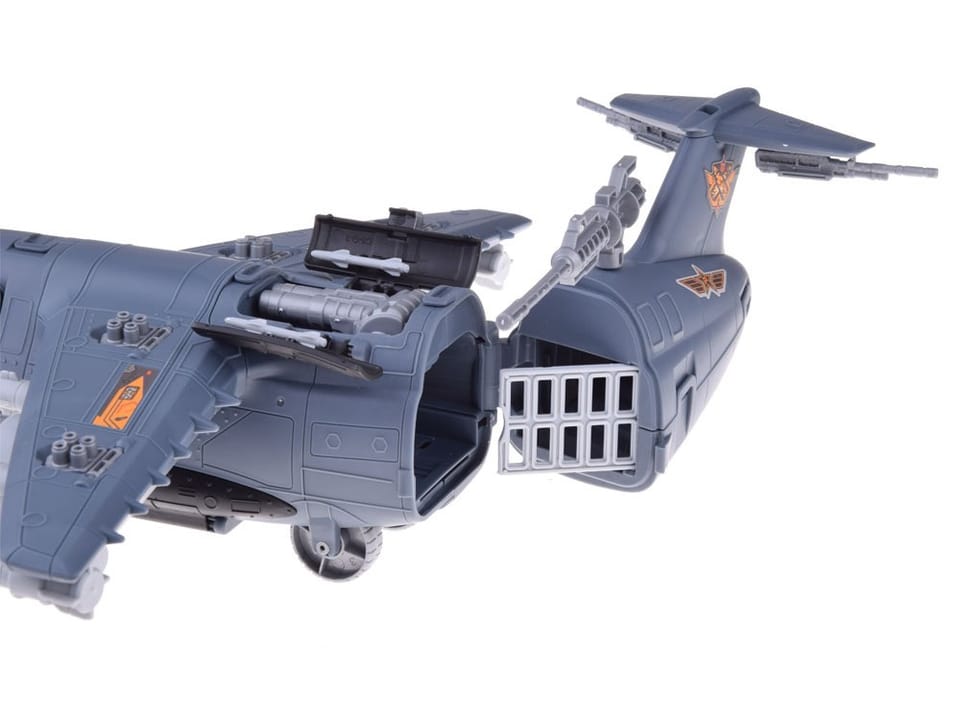 Duże lotnisko wojskowe baza z samolotem to propozycja dla fanów samolotowych zabaw, na pewno zapewni mnóstwo strategicznej zabawy. Zestaw świetnie wykonany z dbałością o drobne militarne szczegóły przeznaczony do zabawy dla małych strategów, kierowców, pilotów wojskowych. Duży wojskowy samolot ma mnóstwo możliwości, które pochłoną małego pilota na długie godziny zabawy. Samolot posiada otwieraną kabinę pilotów, w której umieszczona jest wysuwana rampa, otwierany ogon do luku bagażowego w którym umieszczone jest miejsce na ładunki. Ten latający wojskowy pojazd wyposażony został w dużą ilość karabinów, rakiet. Po otwarciu włazu znajdującego się w górnej części samolotu można wysunąć działo. W skrzydłach samolotu także zostały ukryte działa, które można postawić do góry. Zestaw został wyposażony w matę na której znajduje się mnóstwo pasów drogowych oraz startowych, jak również w pojazdy wojskowe, co sprawi, że zabawa wciągnie na wiele godzin każdego małego miłośnika wojskowych zabaw.