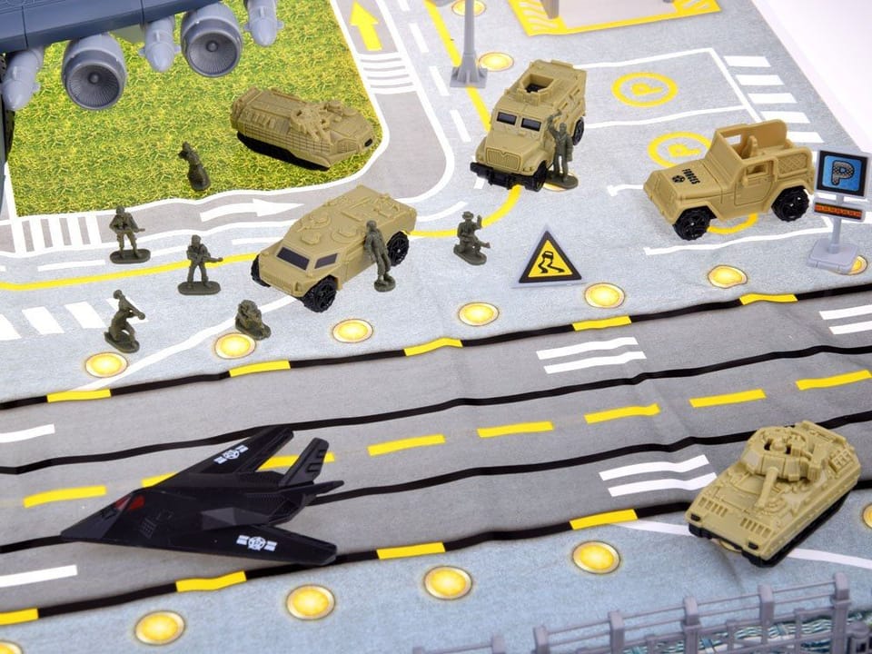 Zestaw zawiera:- foliowa mata- duży samolot- 3 samoloty bojowe- samolot pasażerski- 3 czołgi- helikopter- 4 wojskowe auta- dron wojskowy- 10 małych żołnierzyków- koordynator ruchu naziemnego- 5 znaków- 1 pachołek- latarnia- rampy- ponton- 2 lotniska- barierki
