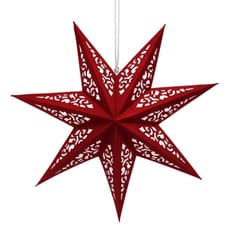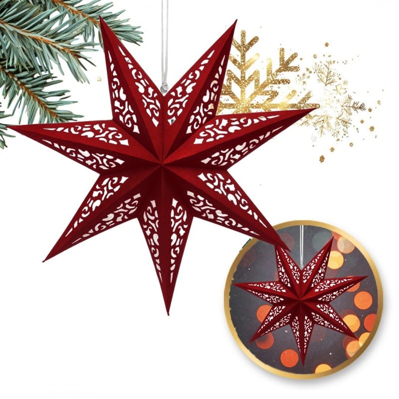 Papierowa Gwiazda Świąteczna Wykonana z solidnego materiałuMożliwość wielokrotnego składania i rozkładania Wymiary:45cm x 45cmDługość sznureczka: 15cmKolor: Bordowy Instrukcja złożenia:1. Wyjmij gwiazdę z opakowania.2. Pociągnij za ściągacz.3. Zawieś w dowolnym miejscu.4. Złożoną przechowuj bez trudności - zajmuje niewiele przestrzeni. Waga: 76gWymiary produktu przez rozłożeniem: 22cm x22cm x 1,5cm Produkt zapakowany w woreczek foliowy.Poczuj klimat Świąt!