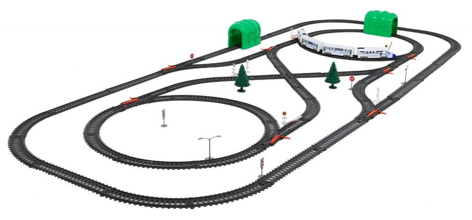 | - 2 x lokomotywa ok. 12,5 cm x 3,5 cm, - 2 x wagon ok. 10 cm x 3,5 cm, - odcinki proste torów, - odcinki torów zakrzywionych, - 2 x tunel, - elementy dekoracyjne (znaki, drzewa słupy itp.), | |