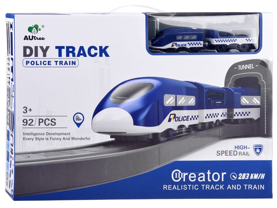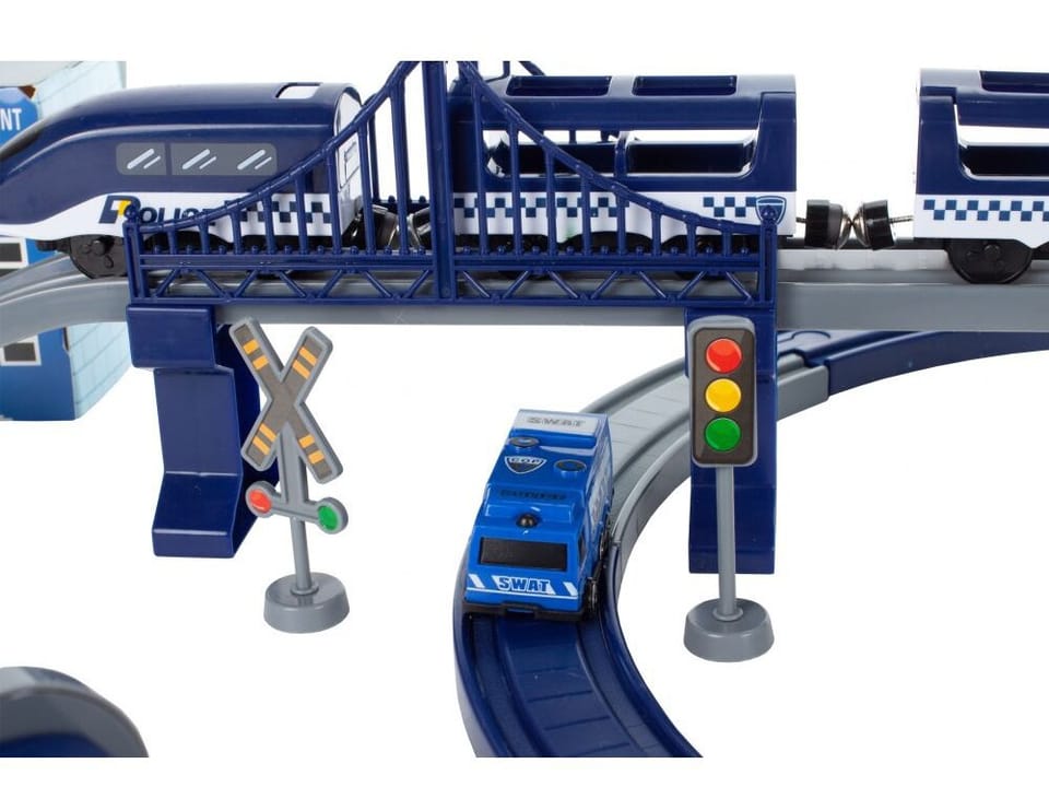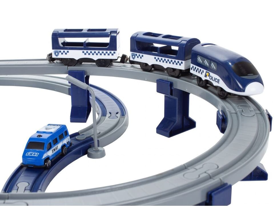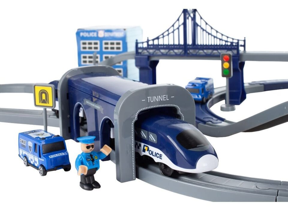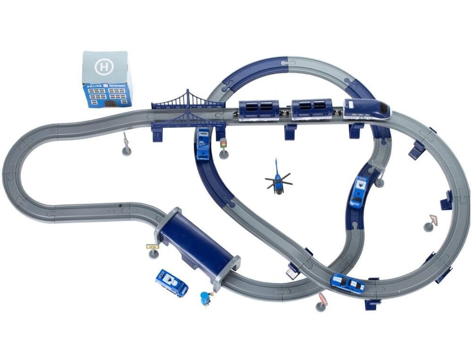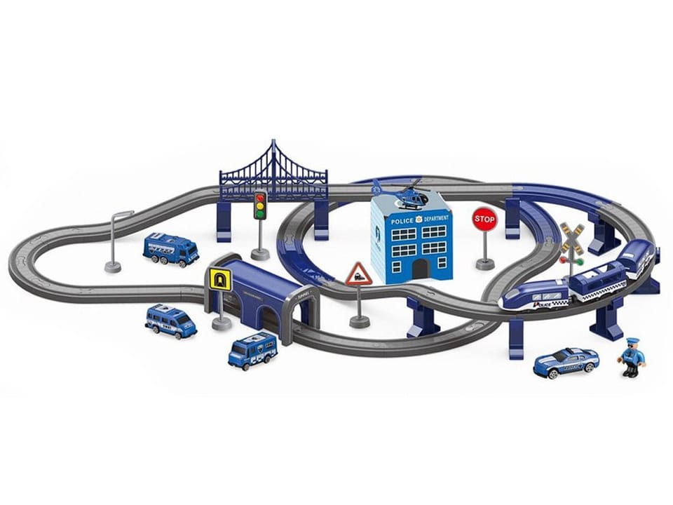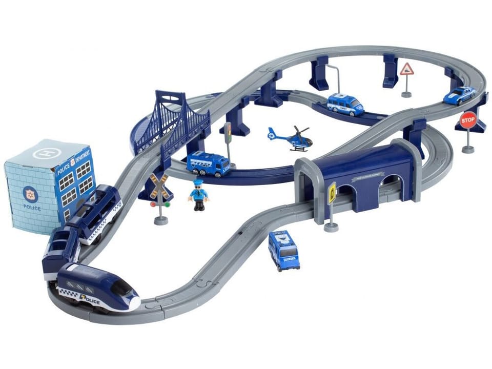 Zestaw policyjny z komisariatem pociągiem, samochodami, a nawet helikopterem zapewni mnóstwo kreatywnej zabawy każdemu małemu stróżowi prawa.Bogato wyposażony zestaw składający się z 92 elementów pozwoli na zbudowanie trasy dla pociągu z mostami, wiaduktami, tunelami. Wokół trasy można porozmieszczać znaki drogowe, posterunek policji z lądowiskiem dla helikoptera.W skład zestawu wchodzą:- lokomotywa elektryczna- 2 x wagon pasażerski z otwieranym dachem- 1 x figurka policjanta- samochód osobowy- helikopter- 3 duże wozy policyjne- elementy do zbudowania trasy, mostów, tuneli budynku komisariatu- znaki drogoweWymiary:- pociąg z wagonami długość składu ok. 32 cm- lokomotywa 11 x 4,5 x 4 cm- wagon 9 x 4,5 x 4 cm- auta policyjne ok. 7 x 3 x 3 cm- helikopter ok. 8,5 x 3 x 2 cm- figurka policjanta wys. ok. 4,5 cm