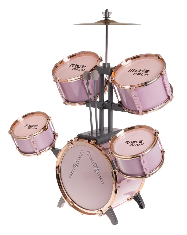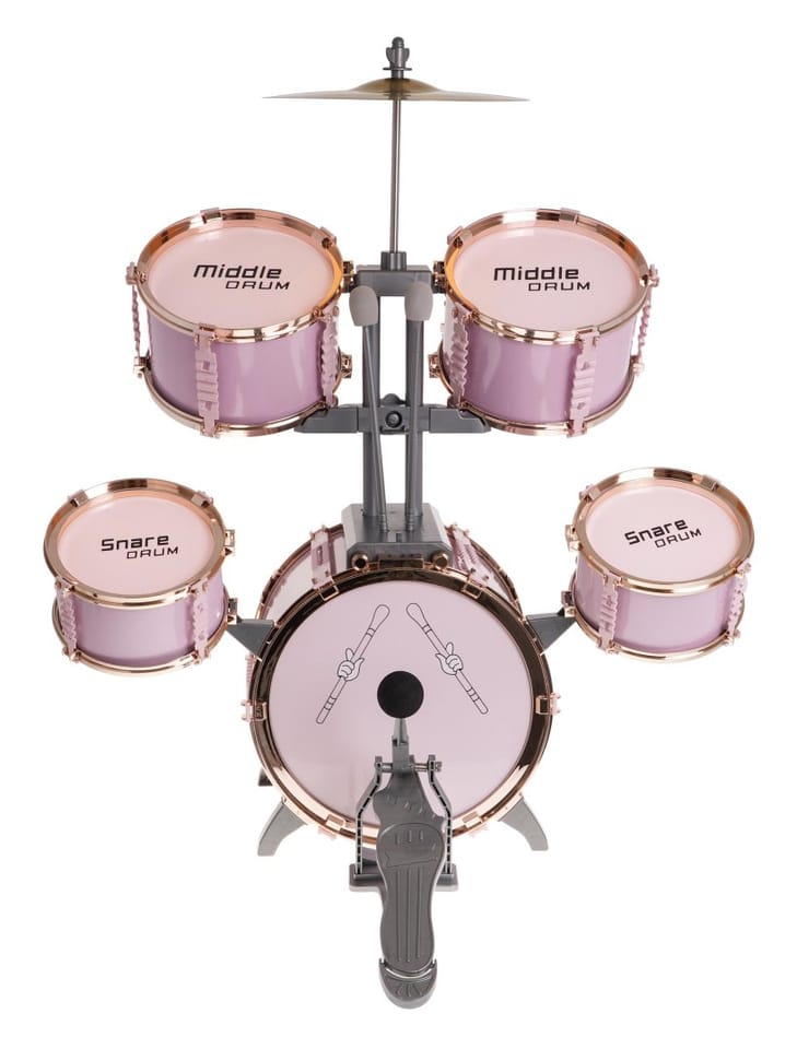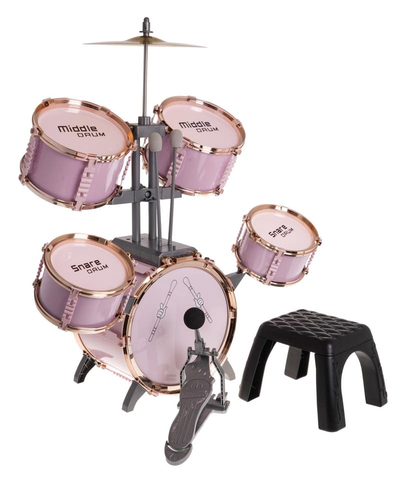 Duża, różowa perkusja z krzesełkiem w zestawie to zabawkowy instrument dla dzieci od 3 - go roku życia. Zestaw zawiera 5 bębnów, talerz metalowy, 2 pałki oraz krzesełko.