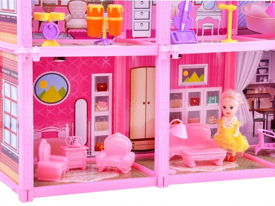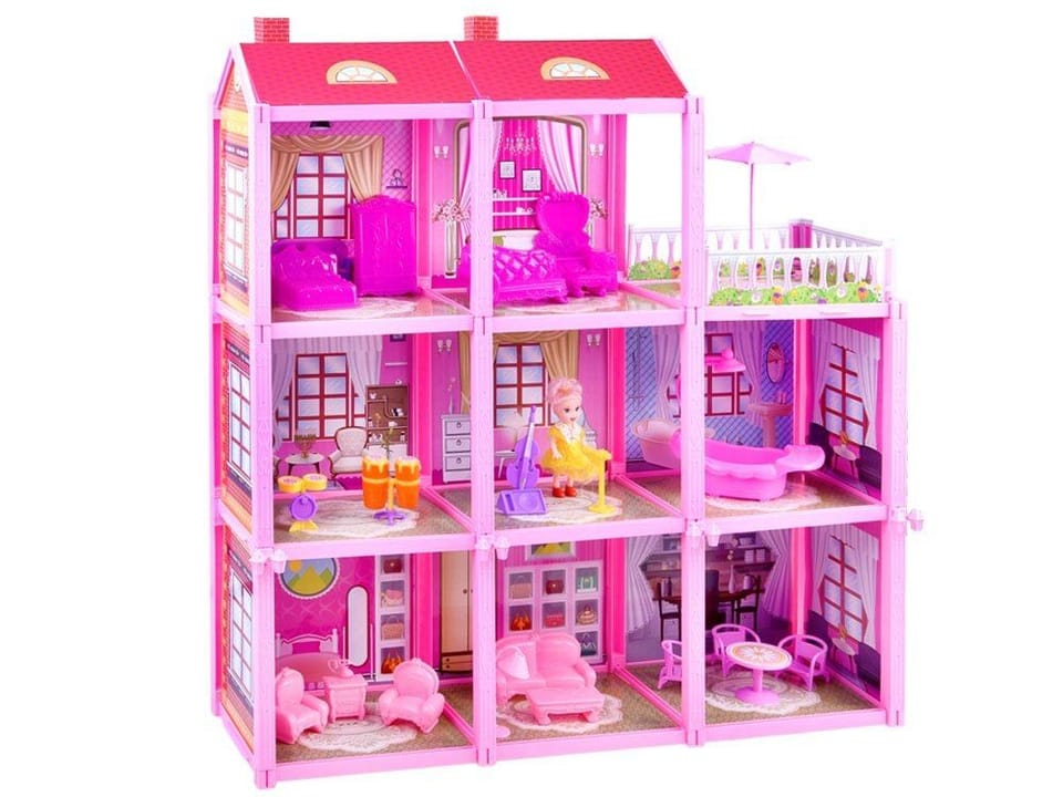 Wielopokojowa willa z meblami przeznaczona jest do zabawy w dom. Konstrukcja zabawki wykonana jest z różowego plastiku, ściany z grafiką pokoi z kartonu. Zestaw bogato wyposażony zapewni mnóstwo kreatywnej zabawy każdemu dziecku. Nie ma jak zostać młodym architektem, dekoratorem wnętrz w tak młodym wieku.Willa wyposażona w 8 pokoi i taras, pozwoli na prowadzenie wesołych zabaw w dom, rodzinę, hotel, pensjonat. Pomysłów na zabawę może być mnóstwo. Każdy pokój można urządzać wg. własnej koncepcji. Na pewno willi znajdzie się miejsce na sypialnie, łazienkę, pokój dzienny a nawet pokój muzyczny, na tarasie można odpoczywać i relaksować się.Zestaw zawiera 26 elementów- 3 piętrowa willa- lalka- łóżko- szafka nocna- szafa- toaletka- krzesełko do toaletki- telefon retro- komoda- 2 x fotele- ława- kanapa- leżanka- stojąca lampa nocna- wanna z natryskiem- meble ogrodowe (stolik, krzesła, parasol)- instrumenty (mikrofon, głośnik, bębny, perkusja, wiolonczela)Meble w całości zostały wykonane z plastiku, z rewelacyjnym odwzorowaniem detali, wzorów, rzeźb. Całość zachowana w tematyce różu.Gospodyni domu to laleczka, ubrana w elegancką suknię. Laleczka wykonana jest z plastiku, posiada ruchome ręce, nogi, obrotową gumową głowę.Wymiary:- laleczka 10 cm - łoże 9 x 7 x 4 cm- szafa 9 x 6 x 3 cm- szafka nocna 3 x 3 x 2 cm- toaletka 9 x 8,5 x 3 cm- komoda 3,5 x 4 x 2,5 cm- kanapa 10 x 3 x 5 cm- leżanka 10 x 4,5 x 5 cm- wanna z natryskiem 13,5 x 7,5 x 14 cm- wymiar pojedynczego pokoju 18 x 16 x 18 cm - wymiar całego domu 60 x 65 x 17 cmZestaw w całości zapakowany został w efektowne kartonowe opakowanie. Rezydencja z tarasem to bez wątpienia najlepszy prezent jaki możesz sprawić swojemu dziecku! Każda dziewczynka marzy o takim domku!Sklep Jokomisiada posiada szereg zabawek typu dom, domki dla lalek począwszy od plastikowych drewnianych willi z oświetleniem.
