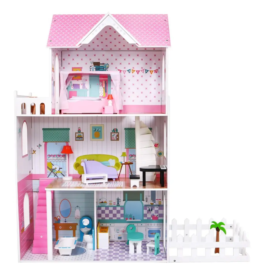Duży Domek z drewna dla lalek Różowy dla dzieci 3+ Akcesoria Meble + 3 piętra