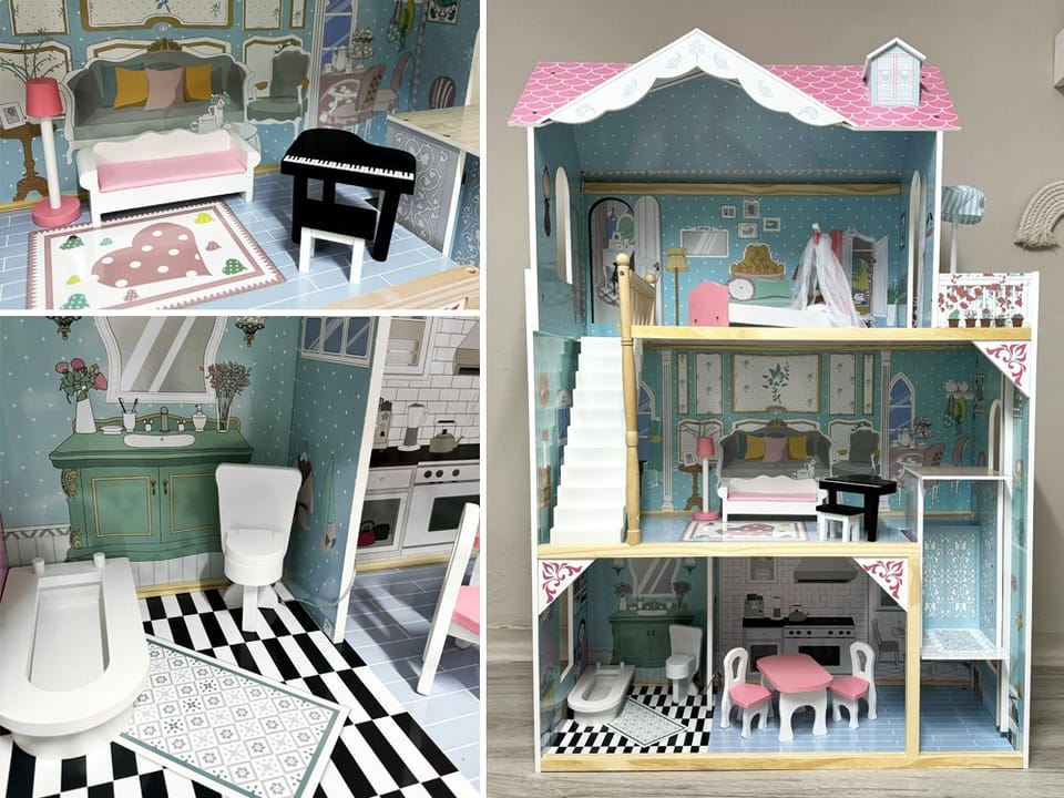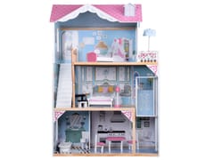 Opis domku i pomieszczeń:Domek to solidna, drewniana konstrukcja, która zachwyca swoją delikatną paletą kolorów. Idealnie nada się do pokoju małej księżniczki! Zawiera dwa piętra oraz parter, na którym znajdziecie wiele udogodnień dla wybranych lokatorów. Domek posiada również okna, przez które wyglądać może każda laleczka.
