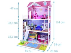Wymiary domku: - wysokość 124 cm- głębokość 38 cm + 28 cm- szerokość 80 cmWysokość pięter:- parter 32,5 cm- piętro 32,5 cm- poddasze 47 cm- długość łóżka: 24,5 cm.Zestaw zawiera:- elementy do złożenia domku- mebelki- kluczyk imbusowy- oświetlenie LED- instrukcję