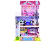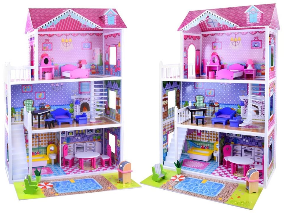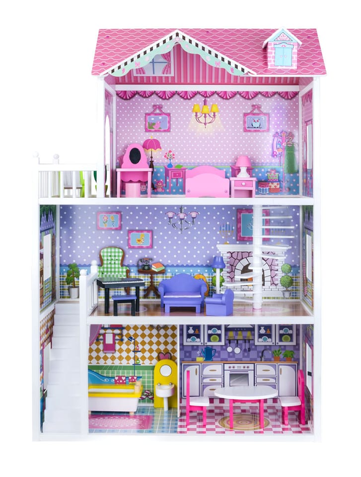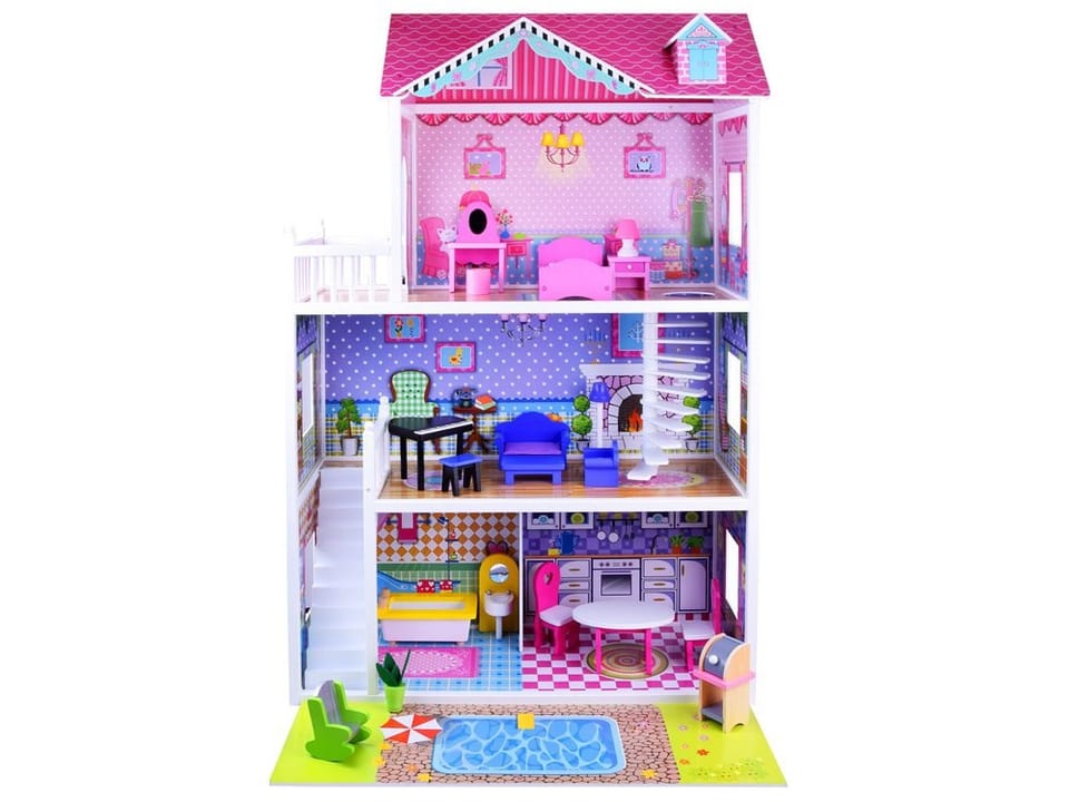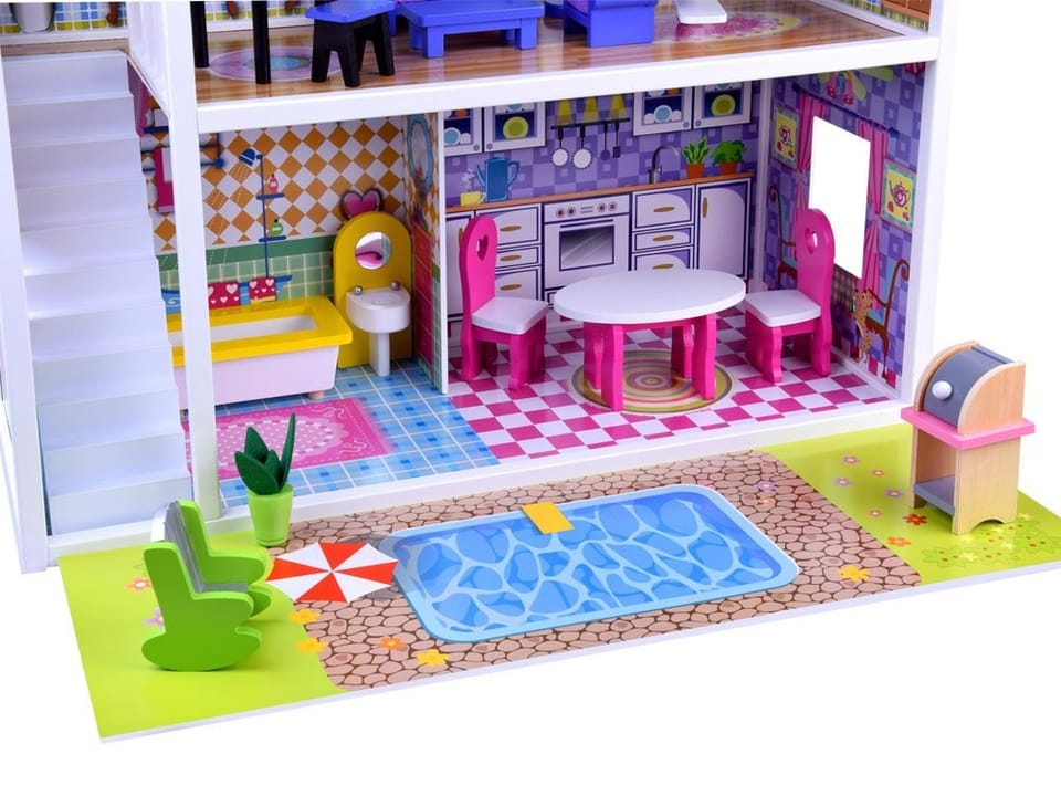 Urocza bajecznie kolorowa willa dla lalek to marzenie każdej dziewczynki. Każda lalka świetnie będzie się w nim czuła.Któż nie chciał by tam zamieszkać? Ten piękny trzypiętrowy drewniany domek dla lalek jest w pełni wyposażony, posiada duże przestrzenne pomieszczenia, w których bez przerwy można przestawiać piękne drewniane mebelki i akcesoria.Bogate wyposażenie zapewni długą i wspaniała zabawę każdemu dziecku. Dodatkową atrakcją jest oświetlenie LED, które tworzy niepowtarzalny efekt. W domku znajdują się umeblowane pomieszczenia:- sypialniana poddaszu- pokój dzienny- kuchnia z jadalnią- łazienka- na każde piętro prowadzą drewniane schody- grill- basenDomek zawiera 19 drewnianych mebli:- stół - grill- 2 krzesła- kanapa- fotel- stoliczek kawowy- wanna - umywalka z lustrem- fortepian- krzesełko- toaletka z krzesełkiem- szafka nocna- lampka nocna- łóżko- lampka stojąca- fotel bujany- kwiatek