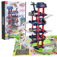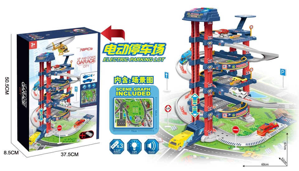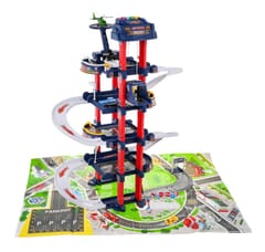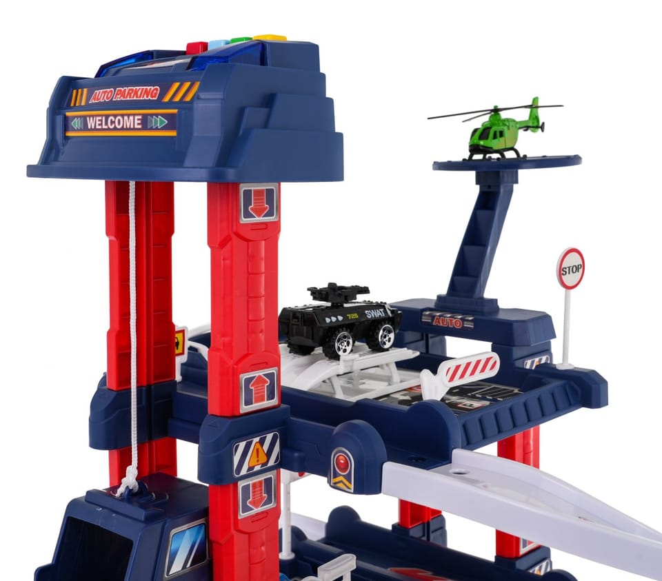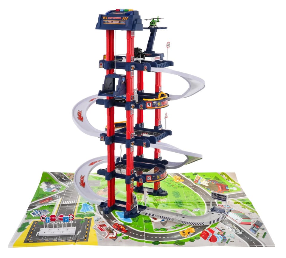 Duży interaktywny parking z elektryczną windą, torem dla autek i matą z drogami to propozycja dla dzieci od 3-go roku życia. Parking posiada wiele poziomów, na które można dostać się za pomocą elektrycznej windy. Każdy z poziomów połączony jest z innym zjeżdżalnią dla resoraków. Na górze garażu znajduje się panel z kolorowymi przyciskami, obsługujący windę. Czerwony guziczek opuszcza windę w dół, a żółty wyciąga ją w górę. Po wciśnięciu niebieskiego przycisku usłyszymy odgłosy charakterystyczne dla policji, straży pożarnej, karetki, a także strzelanie i odpalanie samochodu. Zielony przycisk po naciśnięciu wydaje odgłosy klaksonu. Na panelu sterowania windą migają się również niebieskie i czerwone światełka. Wielopoziomowy parking posiada miejsca parkingowe, stację benzynową, podnośnik dla samochodów oraz lądowisko dla helikopterów. Zabawka zasilana jest bateriami typu 3 x AA 1,5V, baterii brak w zestawie. Parking wykonano w skali 1:64. Funkcje parkingu: - świetlne - migające niebieskie i czerwone światełka na panelu górnym, - dźwiękowe -odgłosy policji, straży pożarnej, karetki, strzelania, odpalania samochodu i klaksonu, - opuszczana i podnoszona winda, - zjeżdżalnia dla autek.