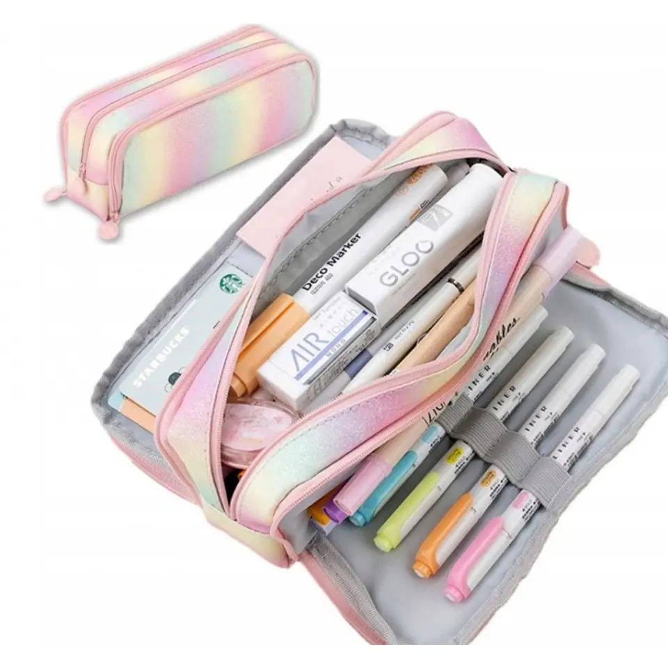 DUŻY PIÓRNIK WIELOFUNKCYJNY SASZETKA TRZYKOMOROWYPojemny, wielofunkcyjny trzykomorowy piórnikWykonany z wysokiej jakości materiałów.Ergonomiczne wykorzystanie przestrzeni. Specyfikacje:Kolor: tęczowy brokatowyMateriał: 100% poliesterWymiary: 22 cm x 8 cm x 9 cmWaga: 105g