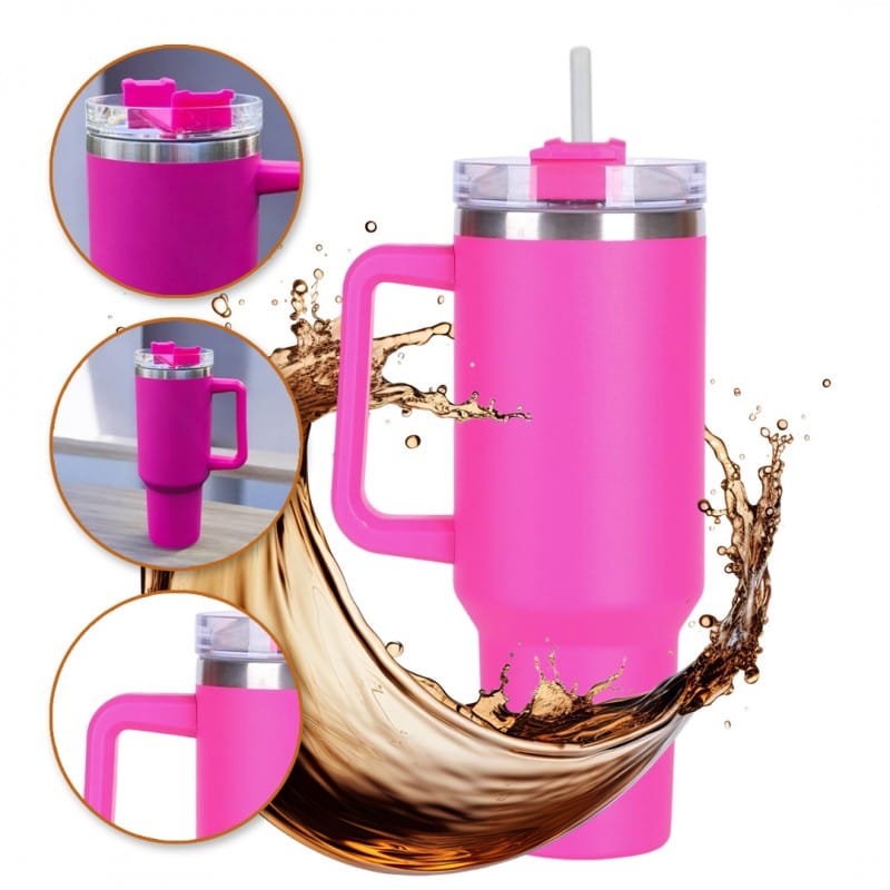 DUŻY POJEMNY KUBEK TERMICZNY Z UCHWYTEM i słomką TERMOS 1L RÓŻOWY CUP10