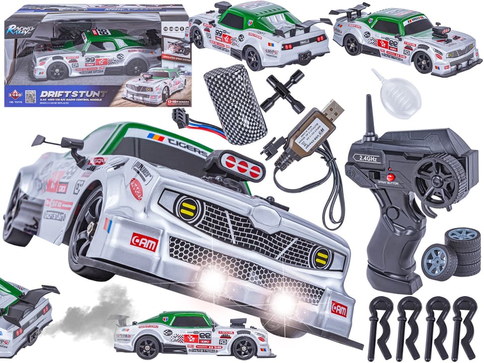 DUŻY Samochód Do Driftu Auto RC Drift 1:16 2,4 GHz PARA DYM Srebrny Dodge 4WD LED